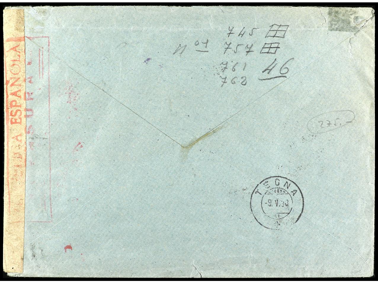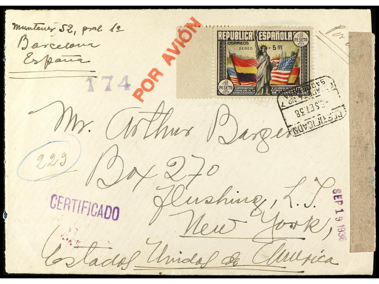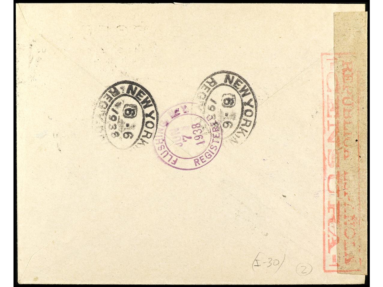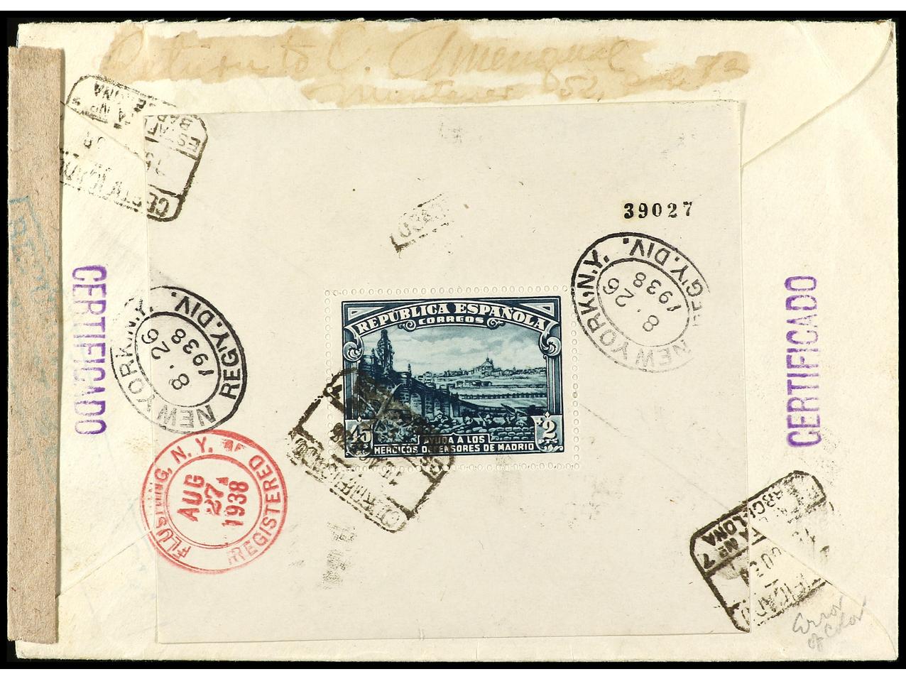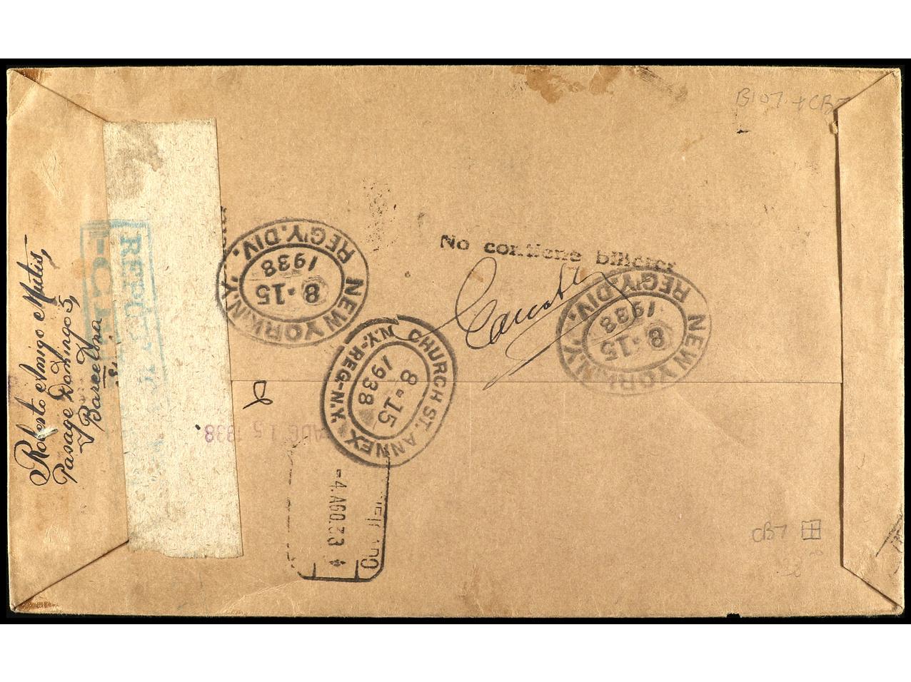 ESPAÑA. 1938. BARCELONA a NEW YORK. Carta certificada, precioso franqueo, al dorso llegada. Ed.757, 673, 745, 769. (Image1) (Image2)