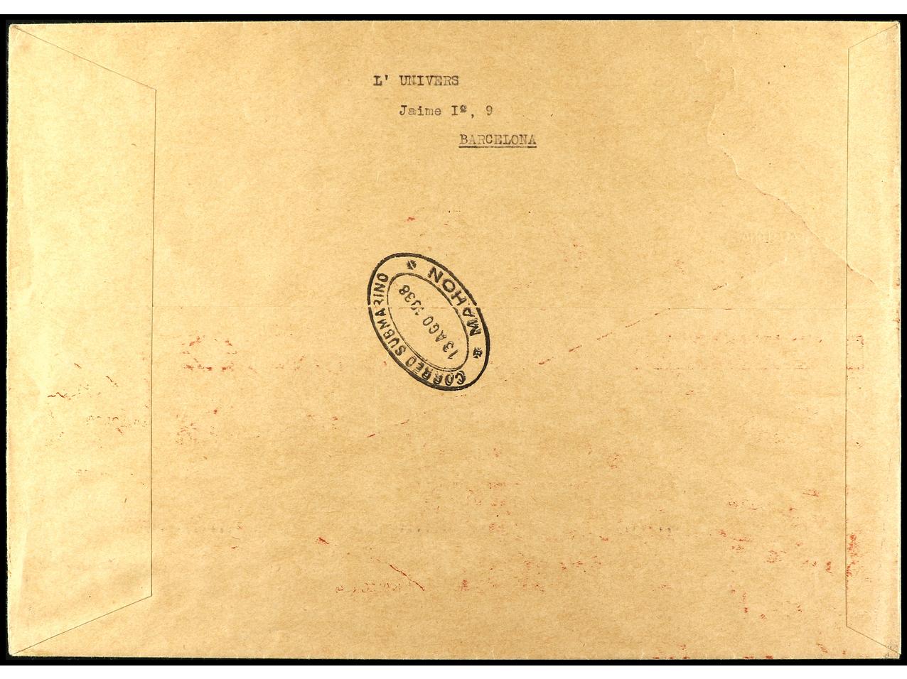 ESPAÑA. 1938. BARCELONA a MAHÓN. 45 cts. + 2 pts., 45 cts., 1 pta. y sellos de Beneficencia de 5 y 10 cts. en sobre conmemorativo del viaje por correo submarino. Al dorso llegada. Muy raros los sobres franqueados con otros sellos que los