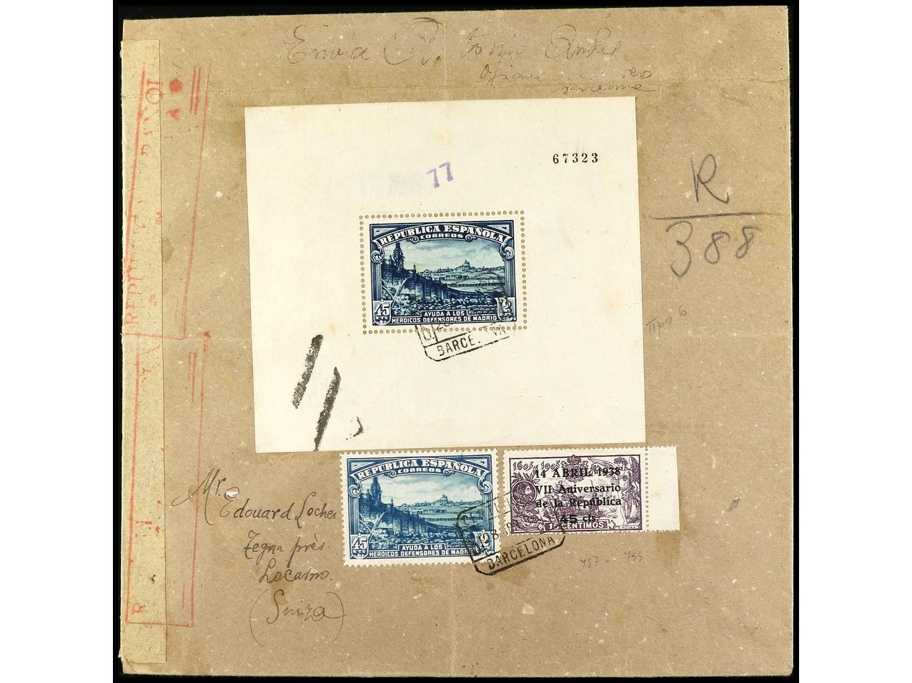 ESPAÑA. 1938. BARCELONA a SUIZA. Carta certificada, precioso franqueo incluyendo la HB. 45 cts. + 2 pts. azul, al dorso llegada. Ed.758, 738 (2), 744, 745 (2).