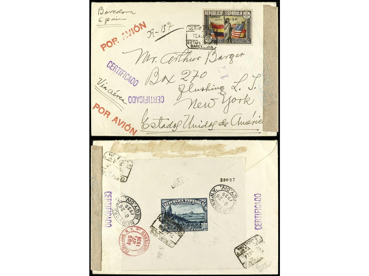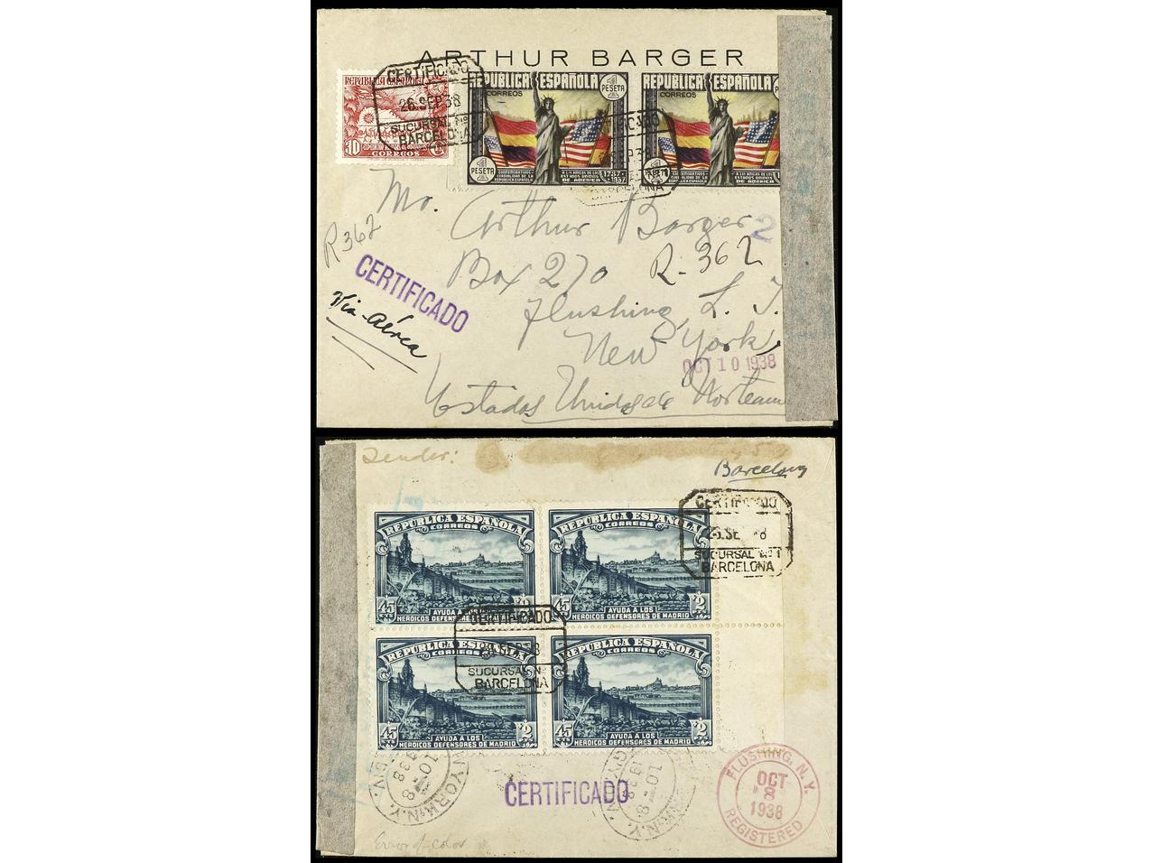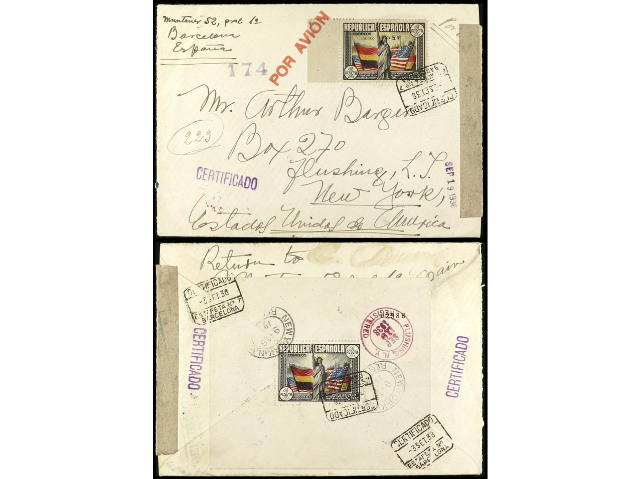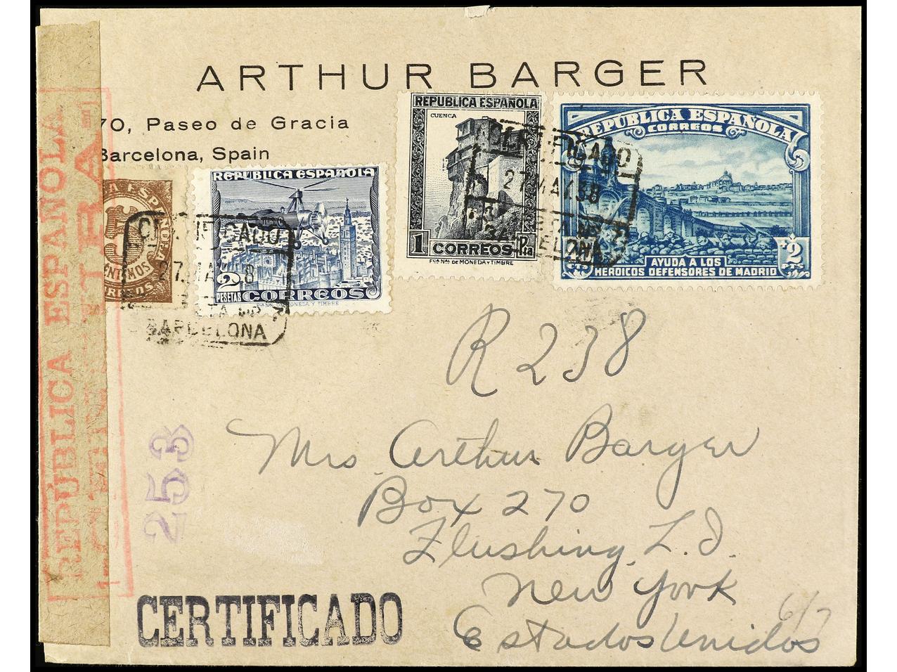 ESPAÑA. 1938. BARCELONA a NEW YORK. Carta certificada, precioso franqueo, al dorso llegada. Ed.757, 767 (4), 768 (4). (Image1) (Image2)