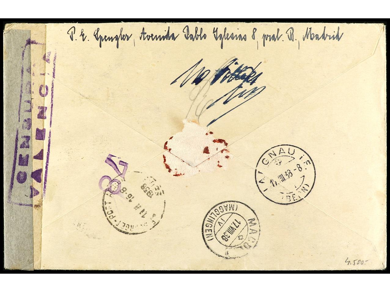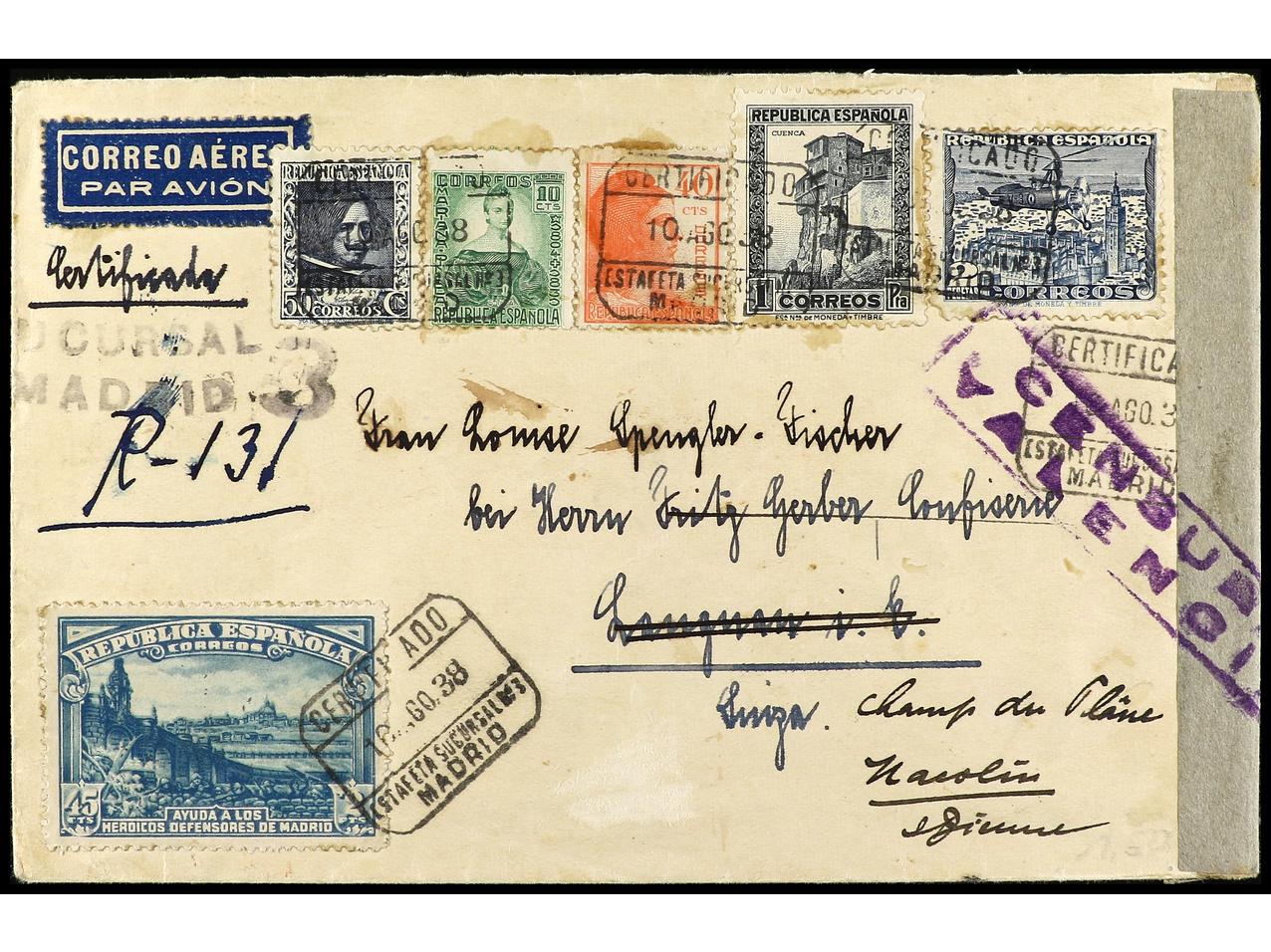 ESPAÑA. 1938. MADRID a SUIZA. Carta certificada, precioso franqueo, al dorso llegada. Ed.757, 673, 682, 738, 751, 769. (Image1) (Image2)
