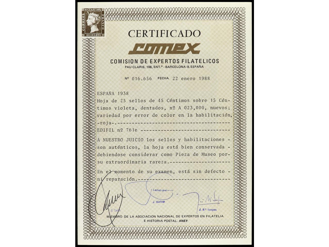 ESPAÑA. 45 cts. s. 15 cts. violeta, HABILITACIÓN EN ROJO. Error de color numeración al dorso A.23,000, manchas de cinta adhesiva que afectan a cuatro sellos. Cert. COMEX. Ed.761hcc. Cat. 6.875€. (Image1) (Image2)