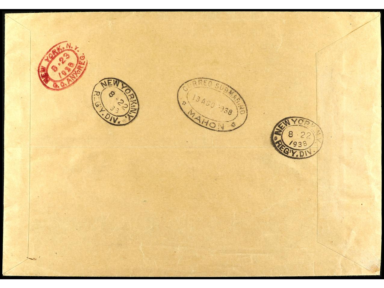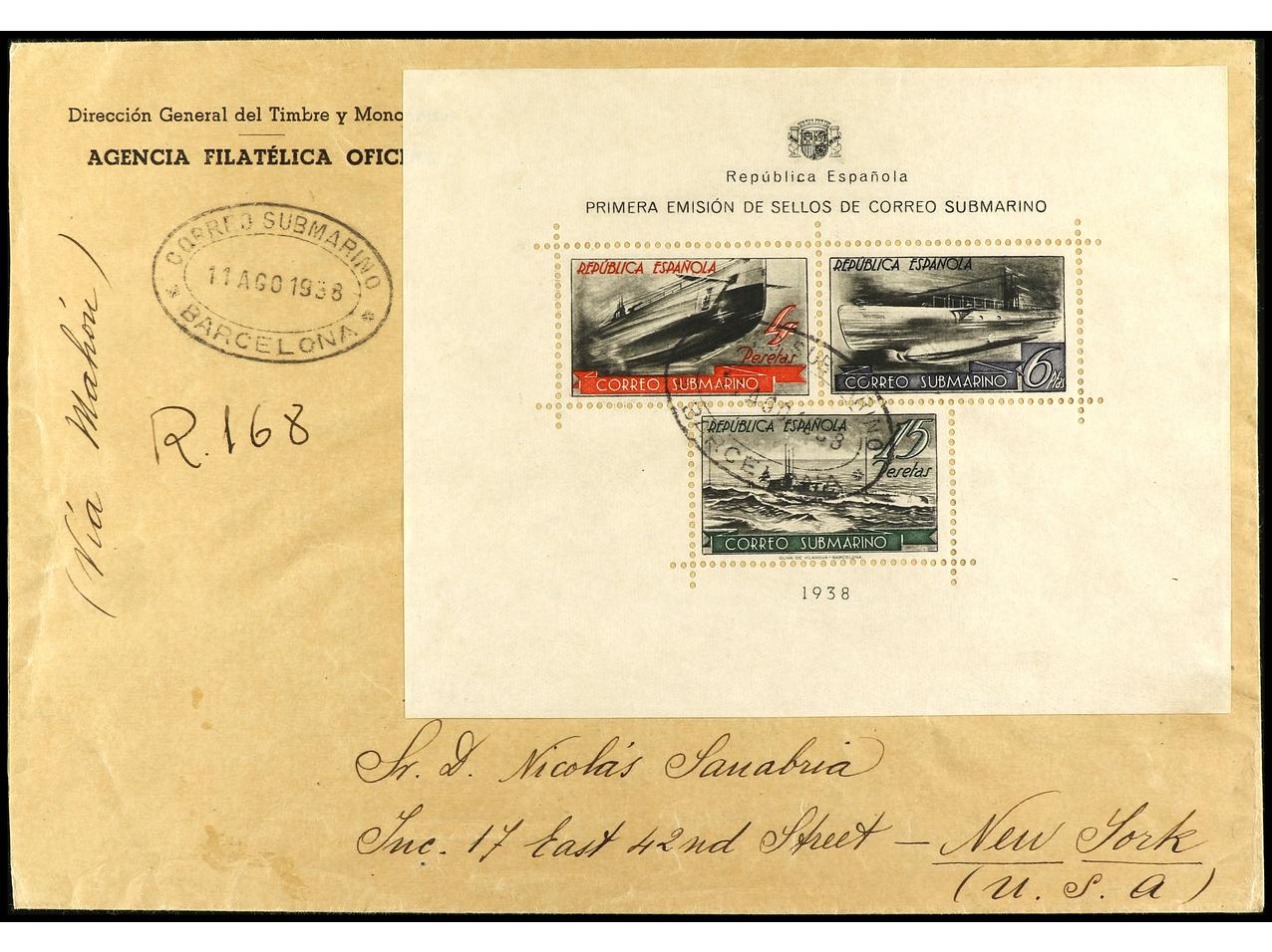 ESPAÑA. 1938. BARCELONA a NEW YORK. H.B. circulada por correo certificado por submarino hasta Mahón y de allí por correo hasta U.S.A. Al dorso llegada. RARÍSIMA, la hojita bloque circulada al exterior es extraordinariamente rara, sólo