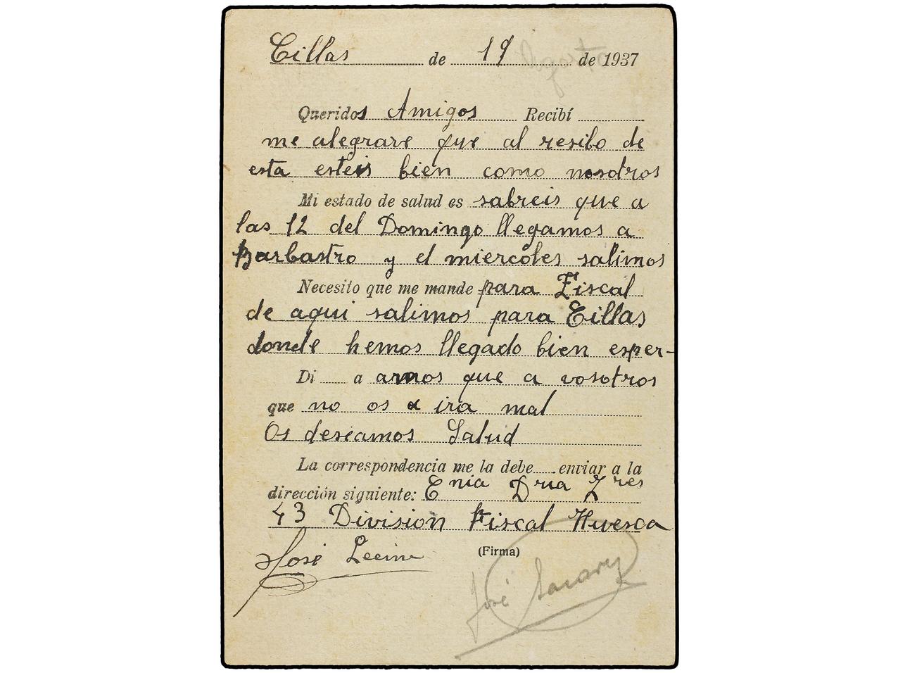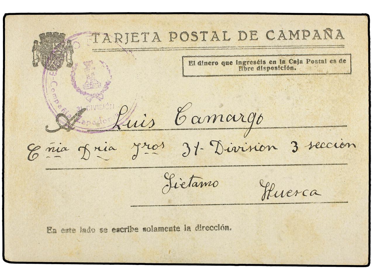 ESPAÑA GUERRA CIVIL. 1937. CILLAS (Huesca) a SIÉTAMO. Tarjeta de Campaña enviada de soldado a soldado, marca de Franquicia 31 DIVISIÓN/COMPAÑIA DE ZAPADORES.