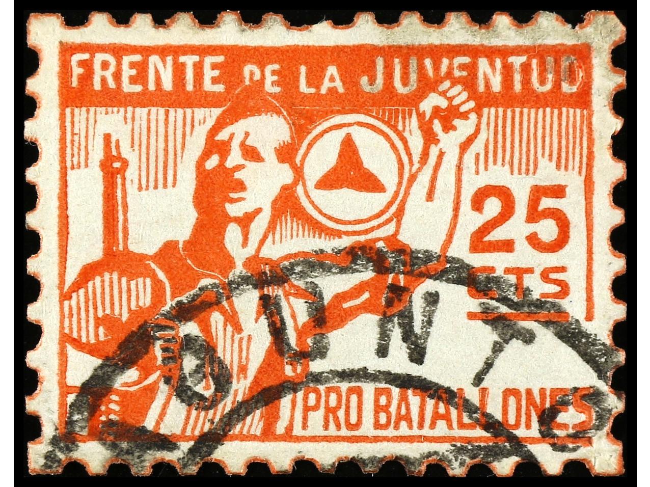 ESPAÑA GUERRA CIVIL. FRENTE DE JUVENTUD. PRO BATALLONES. 25 cts. rojo. No reseñado, usado en Sagunto. MUY RARO. (Image1)
