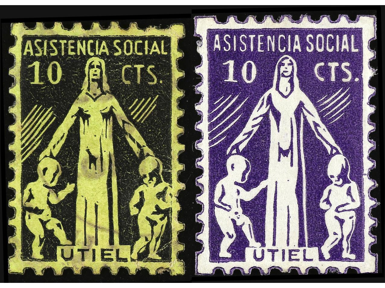 ESPAÑA GUERRA CIVIL. UTIEL (Valencia). 10 c. negro s. verde y 10 c. violeta, no catalogado. RARO. (All. 7 + 7 va.). (Image1) (Image2)