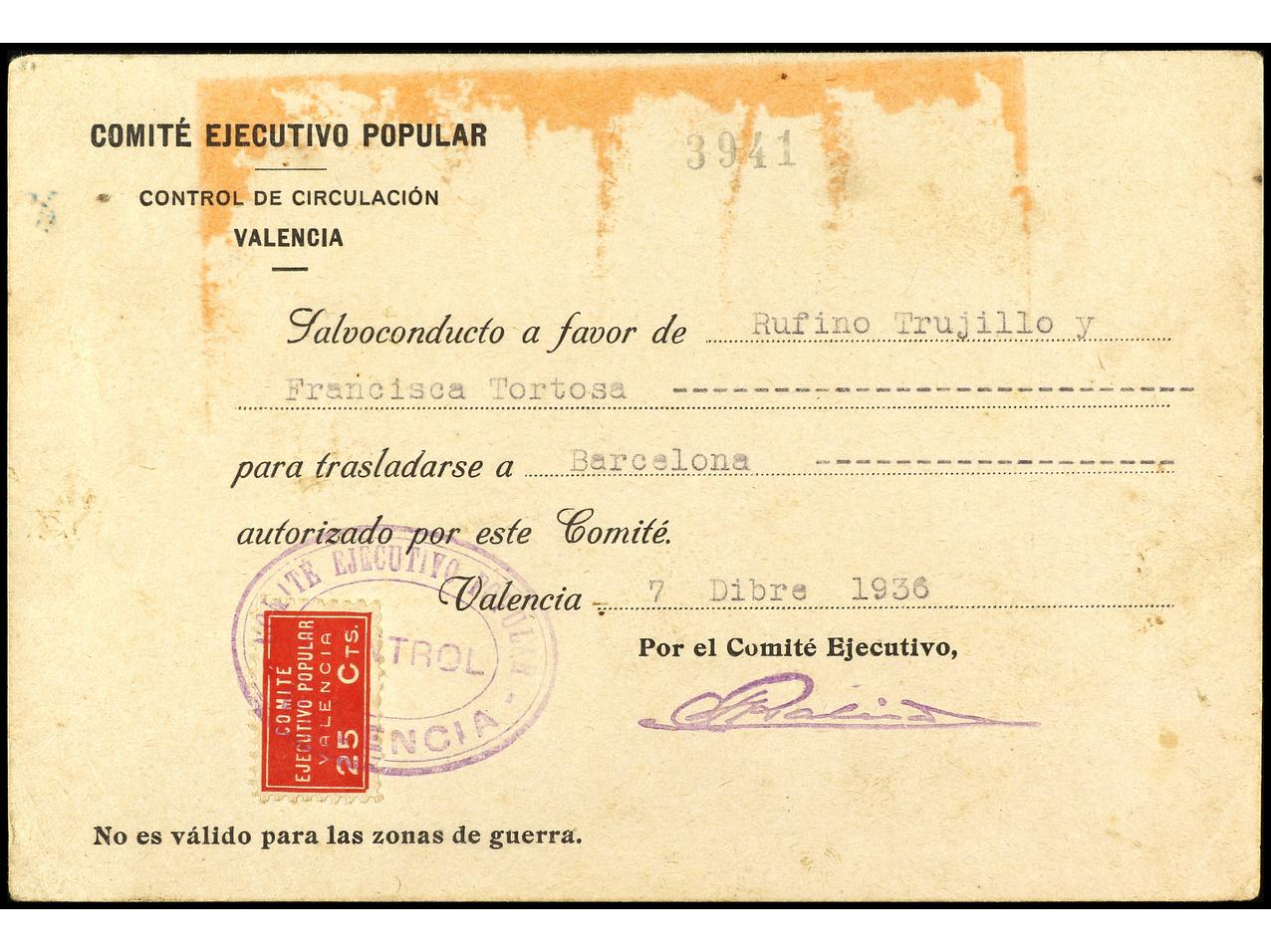ESPAÑA GUERRA CIVIL. VALENCIA. 25 c. rojo. Salvoconducto. Comité Ejecutivo Popular. MUY RARO. (All. 38). (Image1) (Image2)
