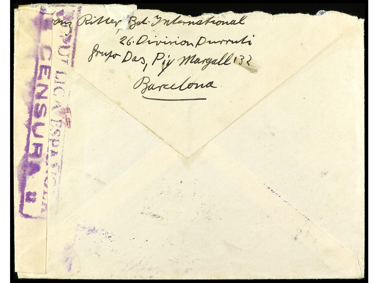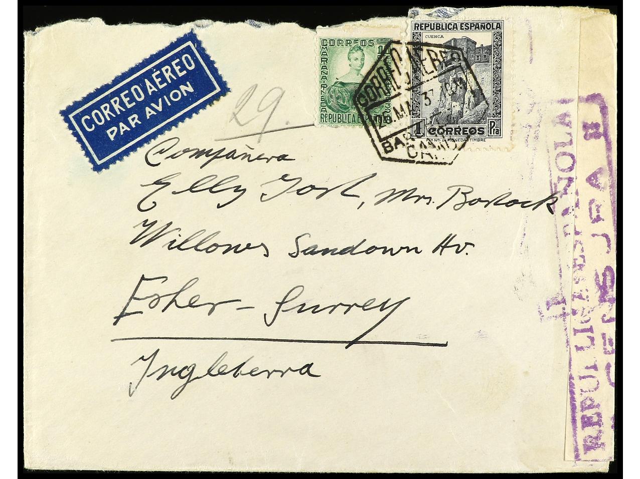 ESPAÑA GUERRA CIVIL. 1937 (26 marzo). BRIGADAS INTERNACIONALES. BARCELONA a LONDRES. 10 cts. y 1 pta. circulada por correo aéreo. Sobre enviado por un soldado inglés del Batallón Internacional, 26 División Durruti, Grupo Dos (Batallón