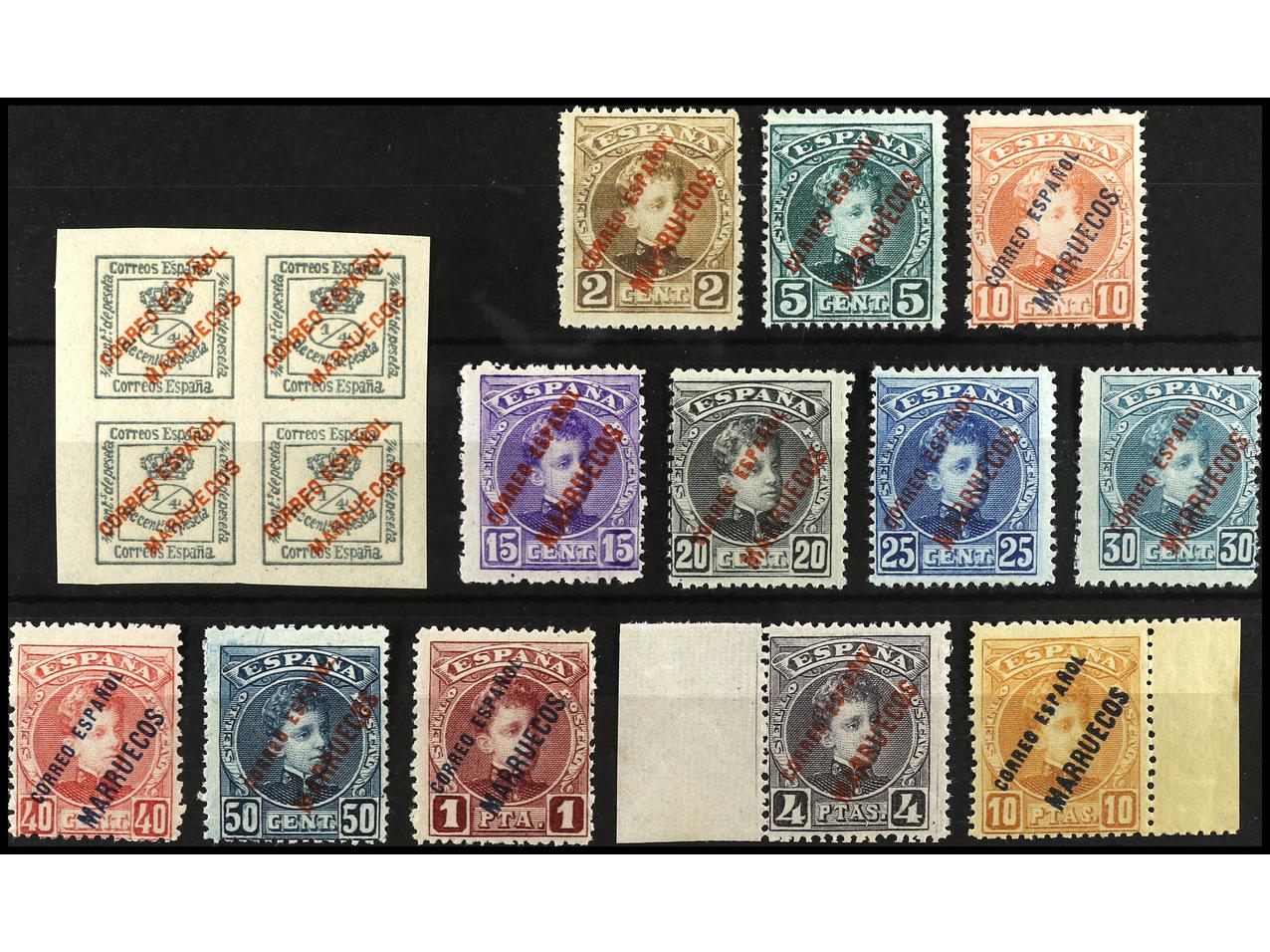 COLONIAS ESPAÑOLAS: MARRUECOS. 2 cts., 10 cts. y 40 cts. Conjunto de tres bloques con diversas variedades en la habilitación. Ed.2, 4, 9. (Image1)