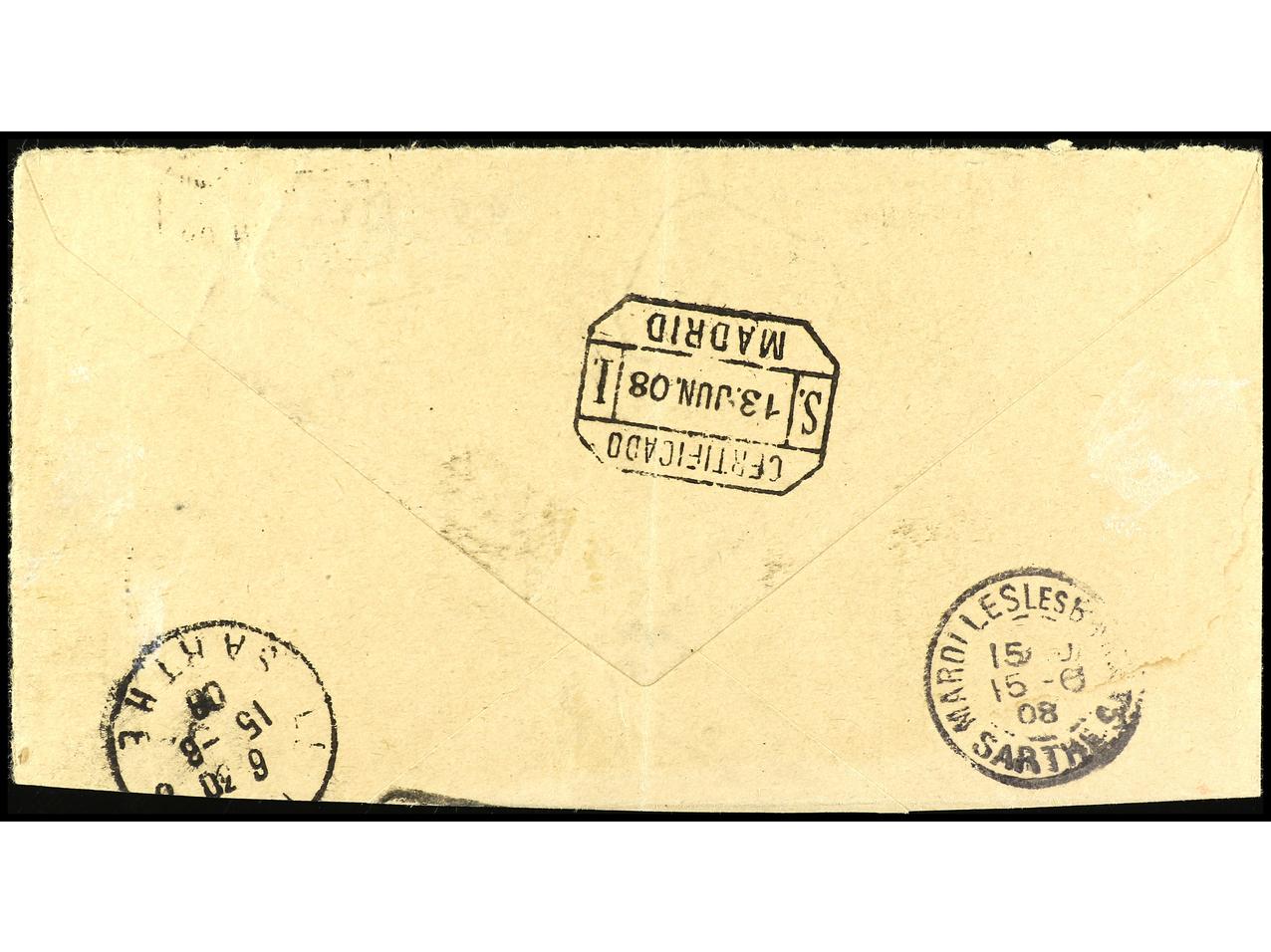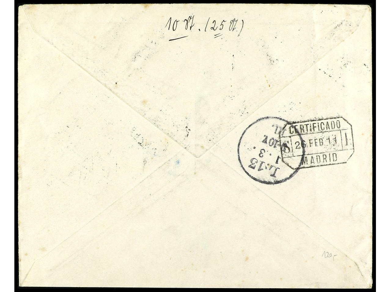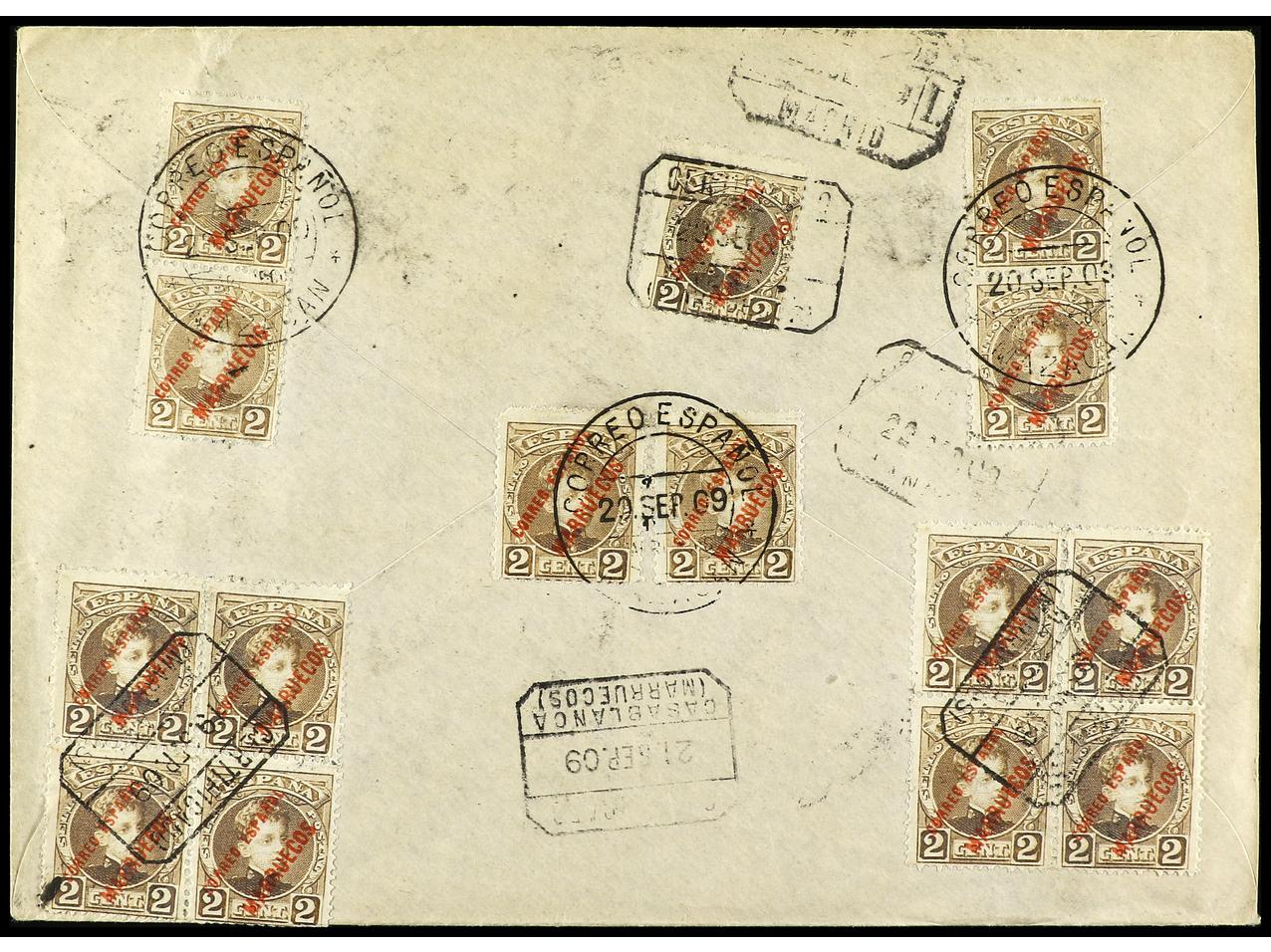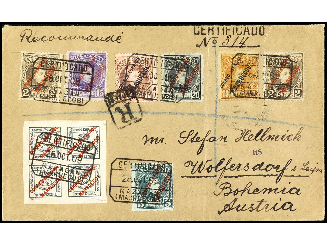 COLONIAS ESPAÑOLAS: MARRUECOS. 1909. MAZAGÁN a AUSTRIA. Carta certificada, espectacular franqueo, al dorso llegada. Muy raro el 10 pts. en carta, muy pocas conocidas. Ed.1/6, 13. (Image1) (Image2)
