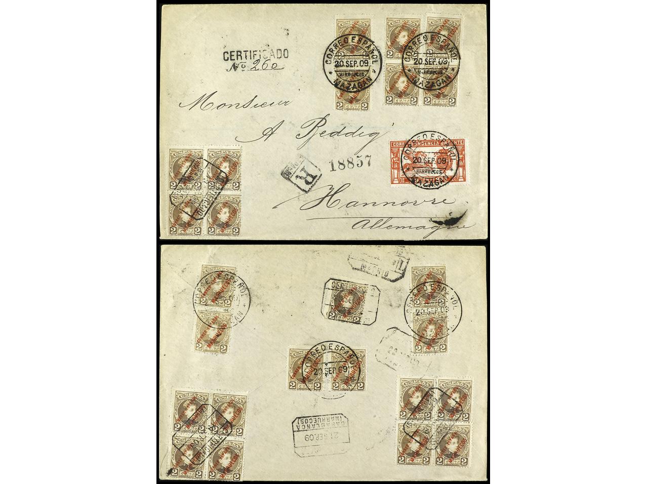 COLONIAS ESPAÑOLAS: MARRUECOS. 1909. MAZAGÁN a ALEMANIA. 2 cts. sepia (25) y sello Urgente español de 20 cts. carmín, al dorso llegada. Espectacular franqueo. Ed.2 (10). (Image1) (Image2)