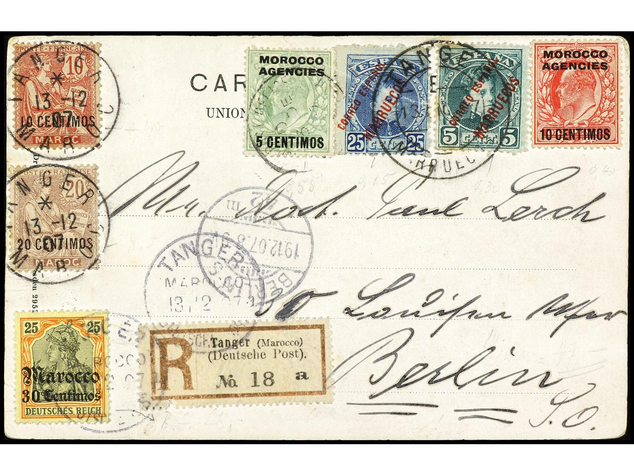 COLONIAS ESPAÑOLAS: MARRUECOS. 1915. TÁNGER a BERLÍN. Tarjeta postal circulada con sellos de Marruecos español, inglés, francés y alemán con etiqueta de certificados de correo alemán. Raro franqueo en carta verdaderamente circulada,
