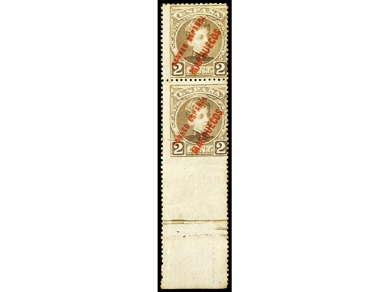 COLONIAS ESPAÑOLAS: MARRUECOS. 2 cts. castaño. Pareja vertical. SIN DENTAR MARGEN INFERIOR, leves manchas del tiempo. MUY RARO, solo 10 conocidos. Ed.2smz.