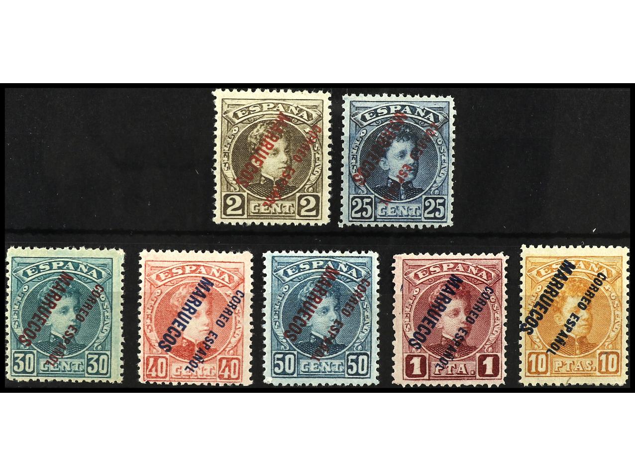 COLONIAS ESPAÑOLAS: MARRUECOS. JUEGO COMPLETO, siete valores HABILITACIÓN INVERTIDA. Raro el conjunto completo. Ed.2/13hi. Cat. 1.115€. (Image1) (Image2)
