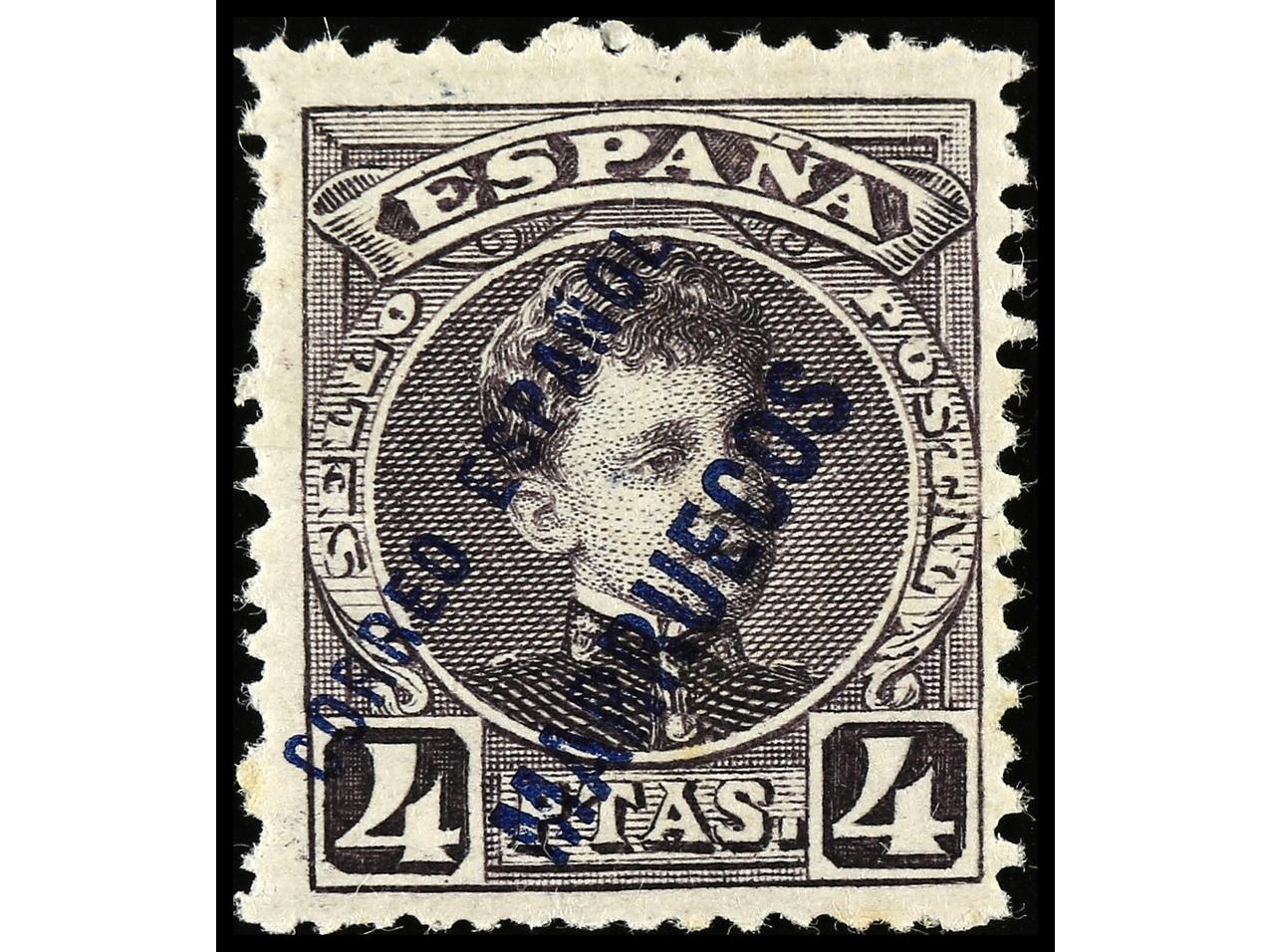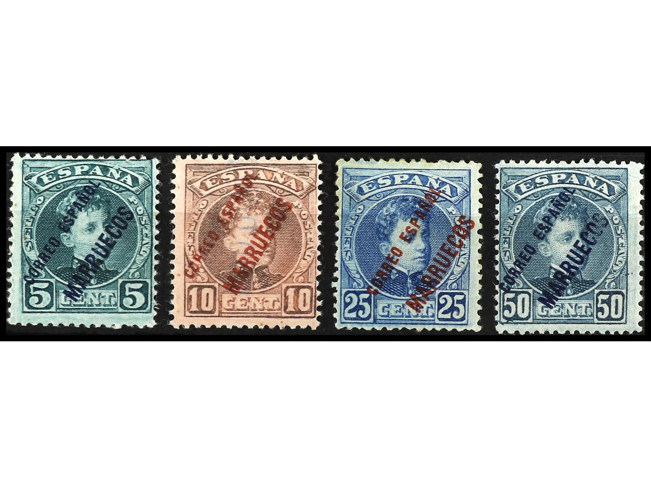 COLONIAS ESPAÑOLAS: MARRUECOS. 5 cts., 10 cts., 25 cts., 50 cts. habilitación en color diferente. ERRORES DE COLOR. Ed.3, 4, 7, 10hcc. Cat. 535€.