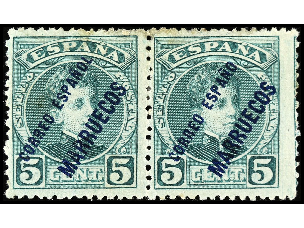 COLONIAS ESPAÑOLAS: MARRUECOS. 5 cts. verde habilitación, AZUL ERROR DE COLOR, pareja, un sello ESPAÑOL sin ´L´. RARÍSIMO, no reseñado en Edifil (Gálvez 7ec). Ed.3hcc + 3hcche. (Image1)