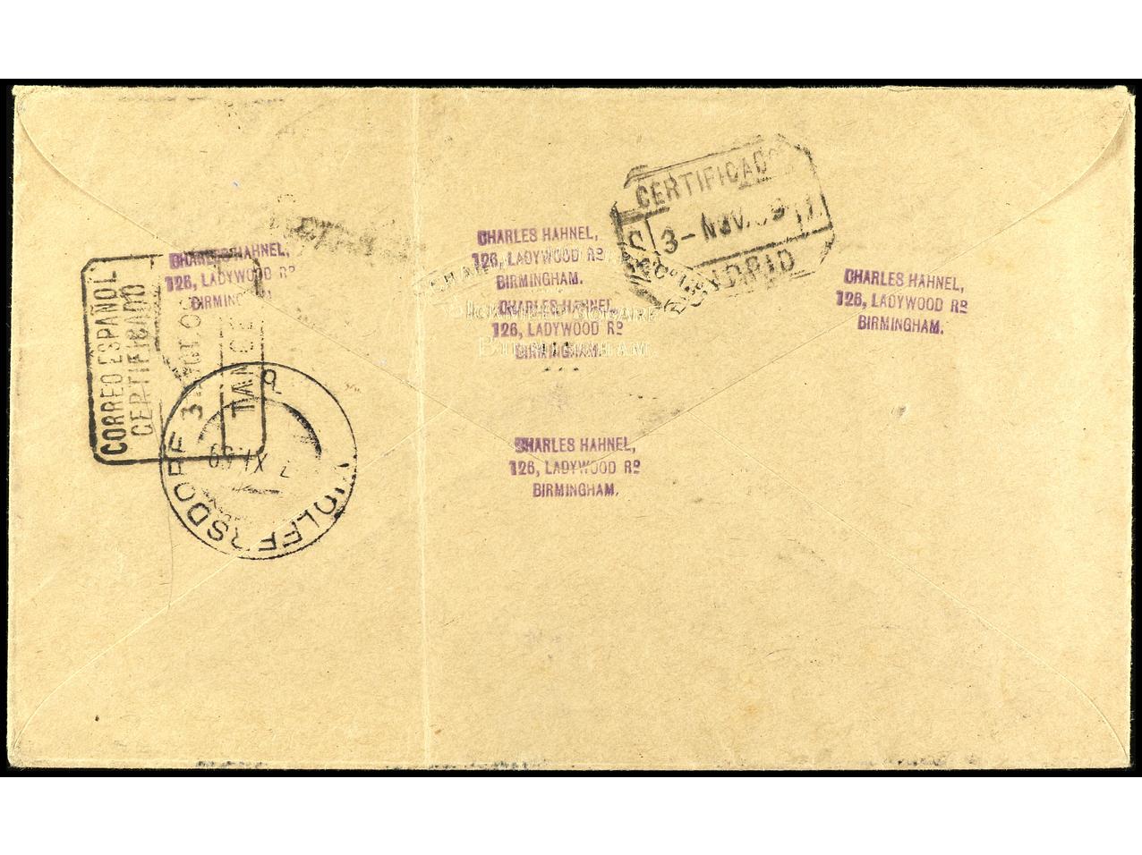 COLONIAS ESPAÑOLAS: MARRUECOS. 1911. TÁNGER a ALEMANIA. Espectacular franqueo, incluyendo el sello de 15 cts. violeta oscuro (reseñado como 9a en el catálogo Gálvez sin precio). Carta certificada, al dorso llegada. Muy raros franqueos.