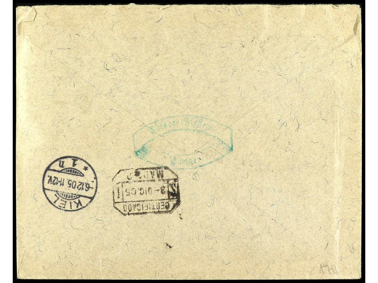 COLONIAS ESPAÑOLAS: MARRUECOS. 1905. TÁNGER a ALEMANIA. 4/4 cts. verde (2), 5 cts. verde (5) y 25 cts. azul. Carta certificada, al dorso llegada. PRECIOSA. Ed.1 (2), 3 (5) y 7. (Image1) (Image2)
