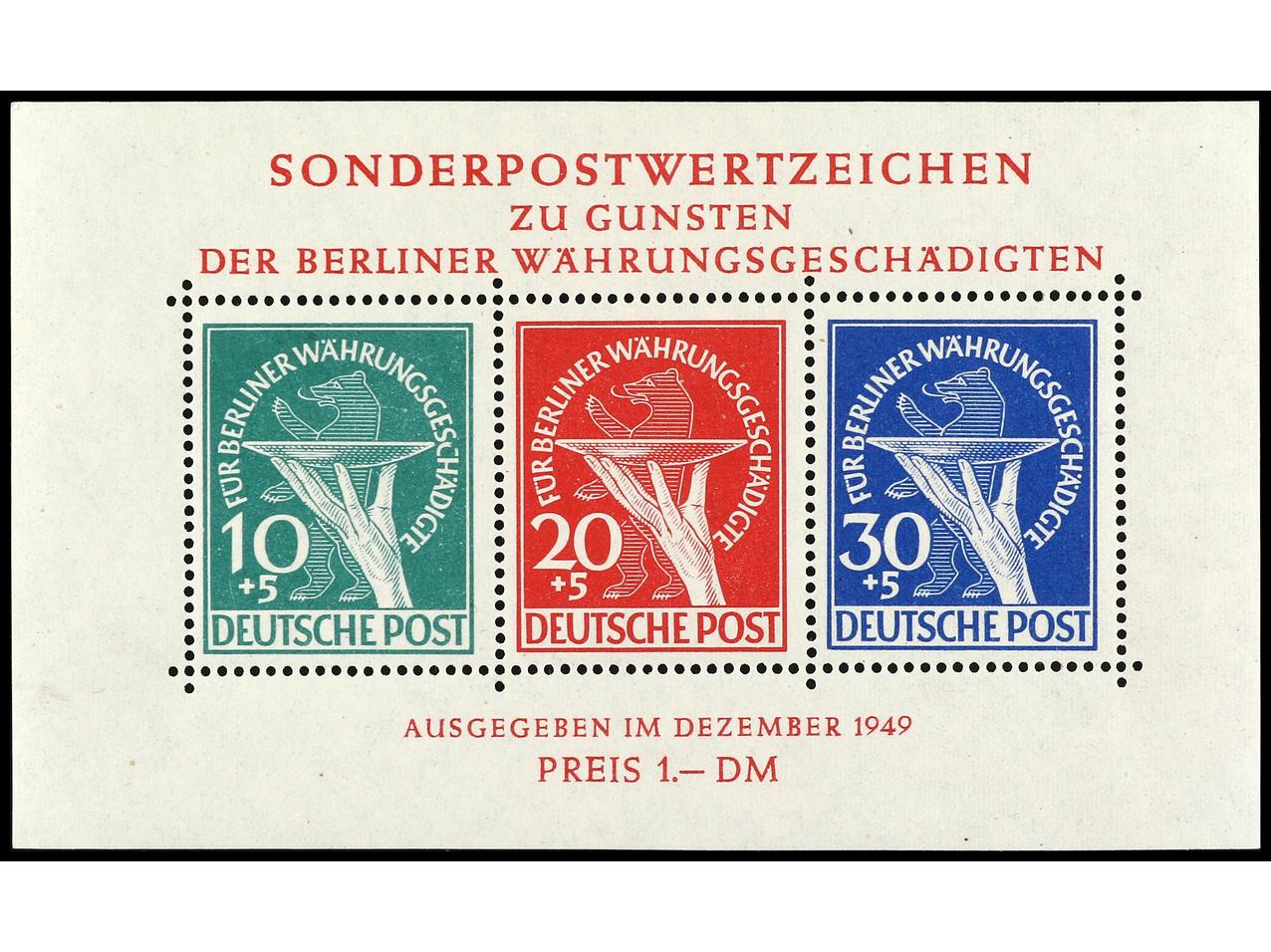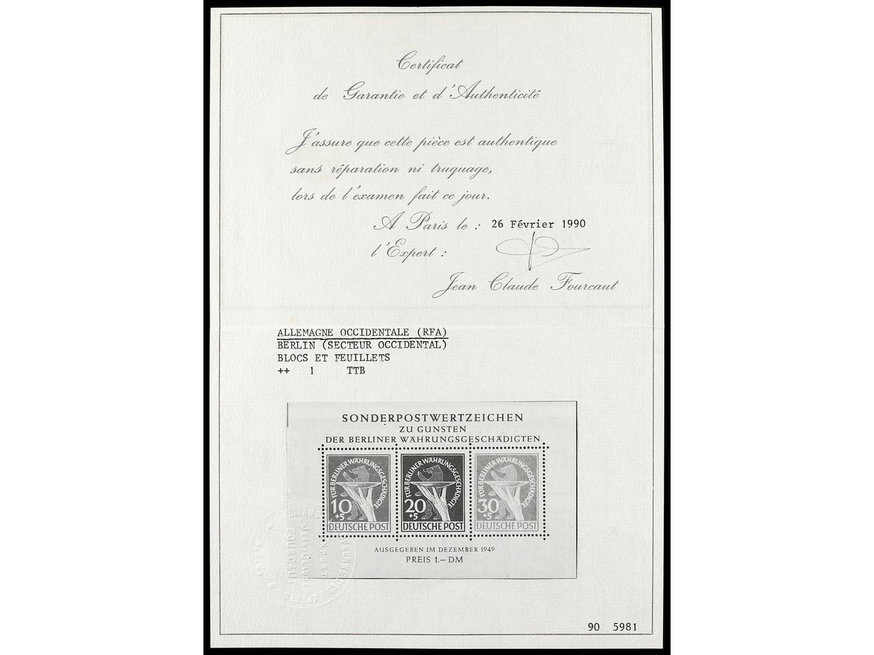 1162 nh imageALEMANIA: BERLIN. 1949. REFORMA MONETARIA. Cert. FOURCAUT. Yv.HB 1, Mi. Block 1. Cat. 1.100€. (Image1) (Image2)