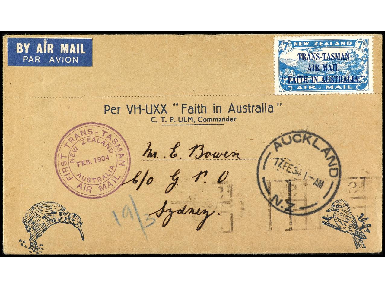 1176 c imageNUEVA ZELANDA. 1934 (17 febrero). Primer Vuelo NUEVA ZELANDA-AUSTRALIA. Al dorso llegada. Yv.5. (Image1) (Image2)