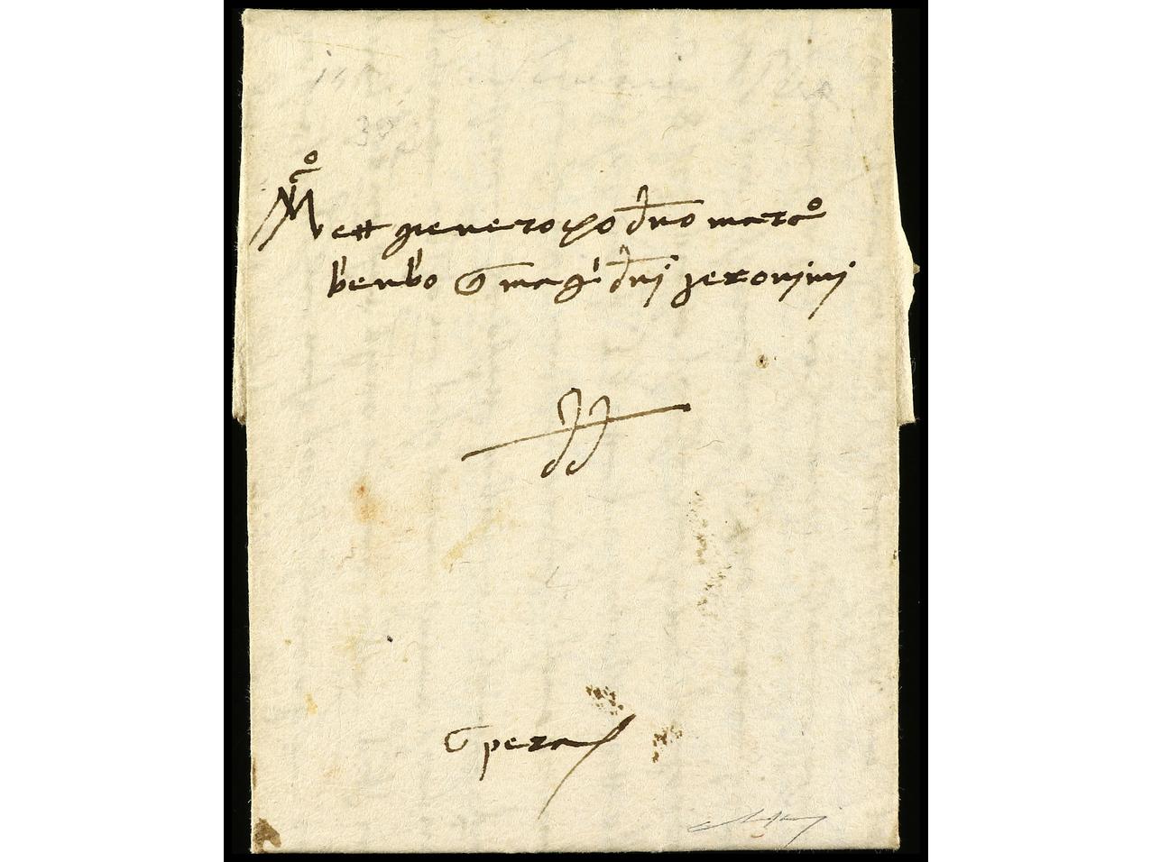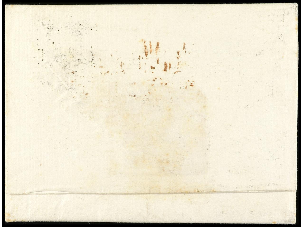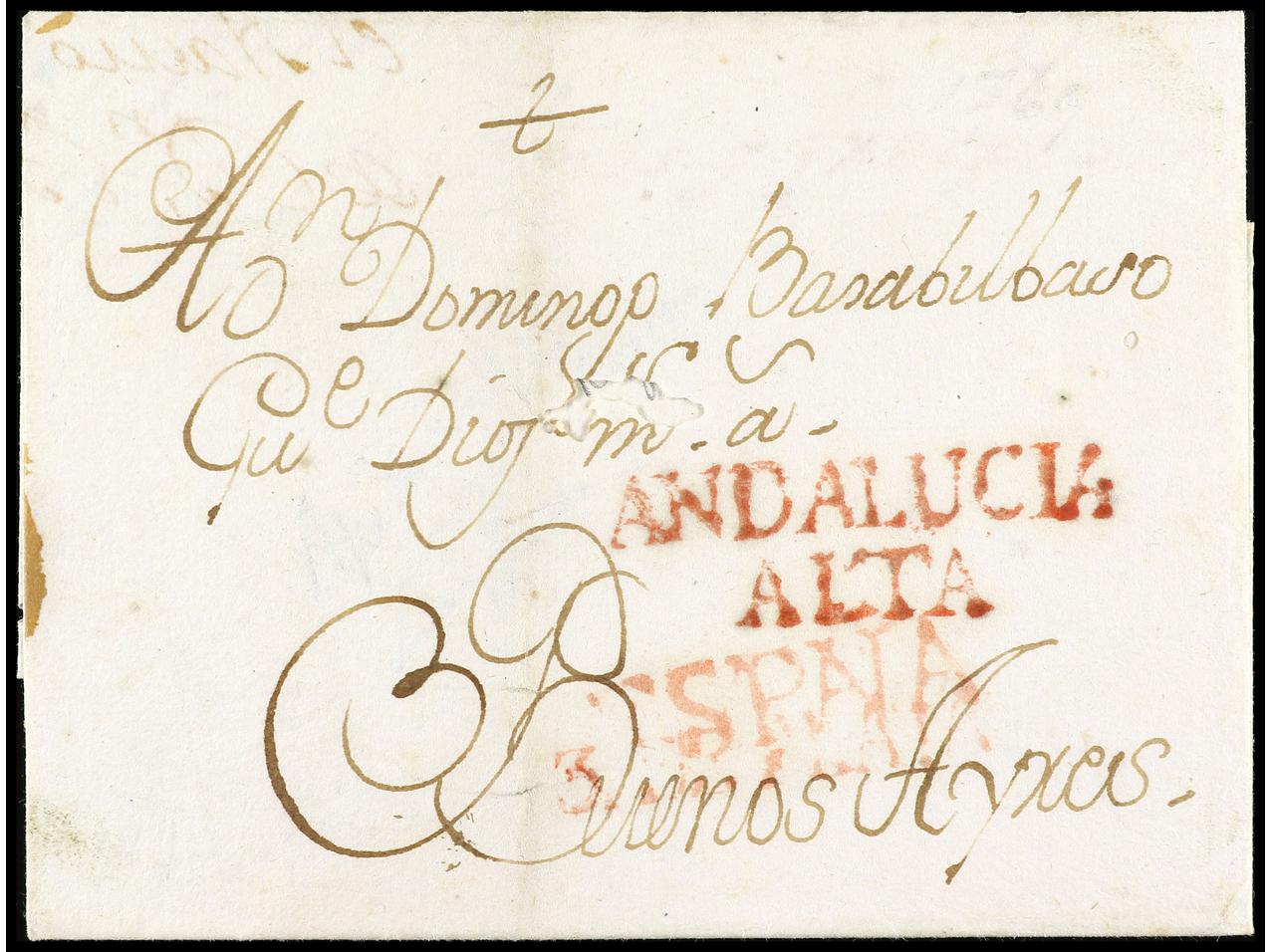 1166 c imageARGENTINA. (1767 ca.). Envuelta a BUENOS AIRES. Marca ANDALUCIA/ALTA y ESPAÑA y 3 DE PLATA estampadas en Cádiz. Carta dirigida a Domingo de Basabilbaso que dejó de ser Administrador de Correos en 1770. Una de las primeras cartas conocidas llegadas a Argentina. (Image1) (Image2)