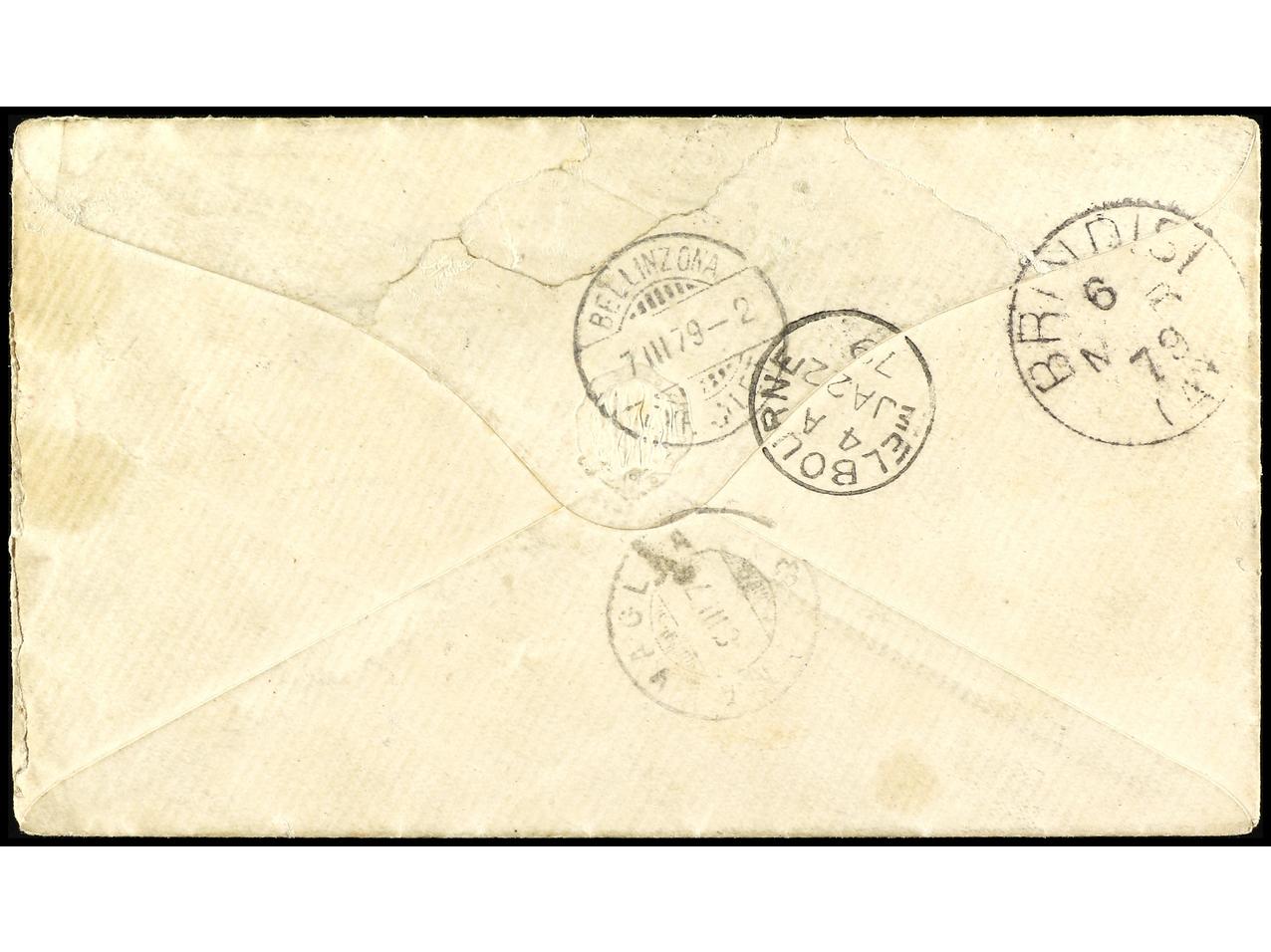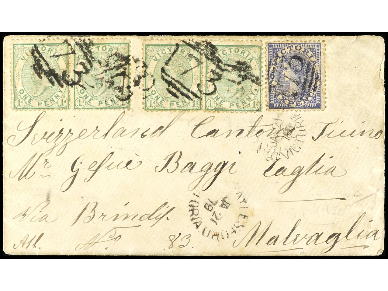 1171 c imageAUSTRALIA. 1879. DAYLESFORD (Victoria) a SUIZA. 1 d. verde (4) y 6 d. azul. (Image1) (Image2)