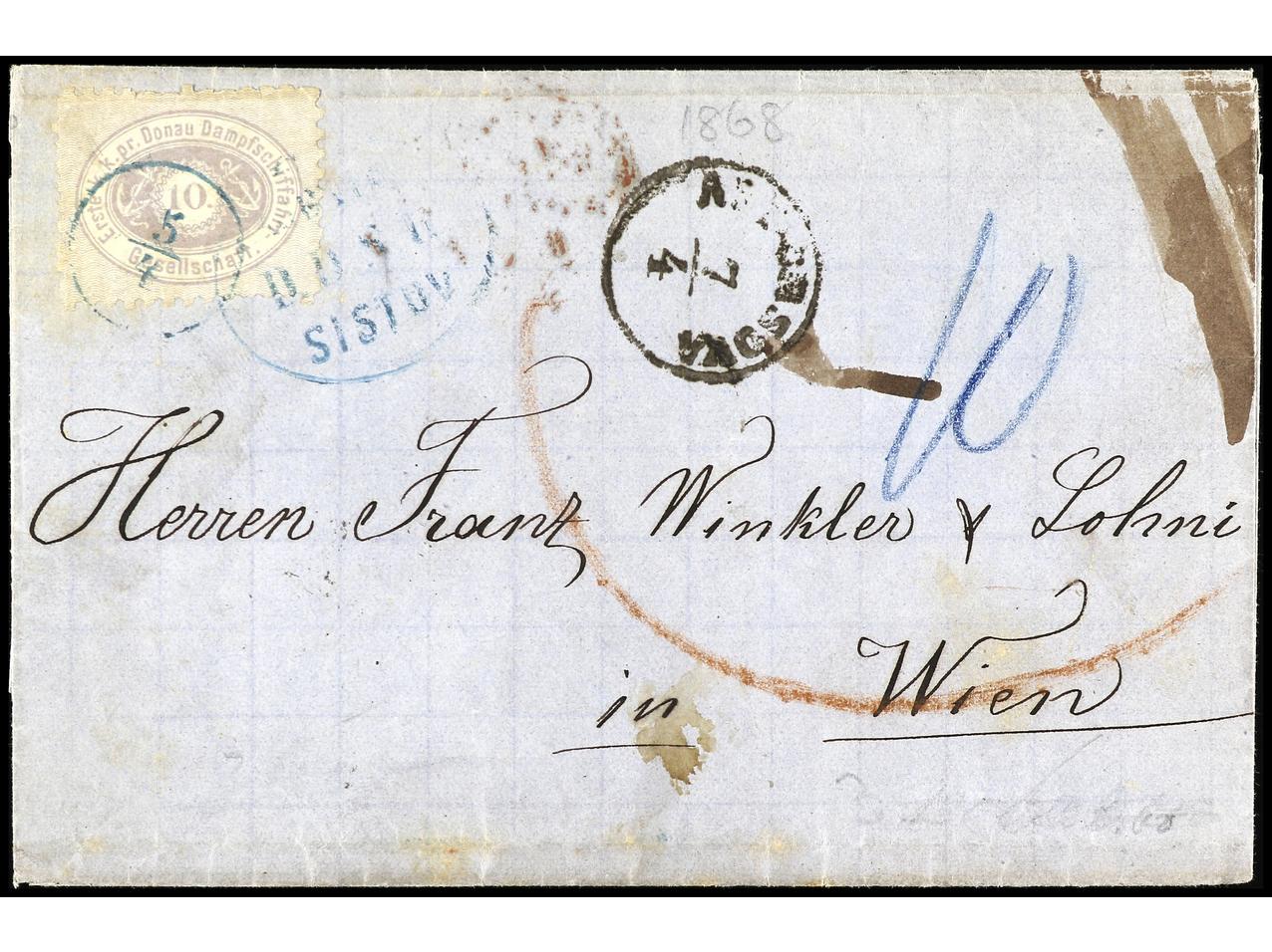 1177 c imageAUSTRIA. 1866. SISTOV a VIENA. Circulado con sello de 10 fi. lila de la Compañía del Danubio. (Image1) (Image2)