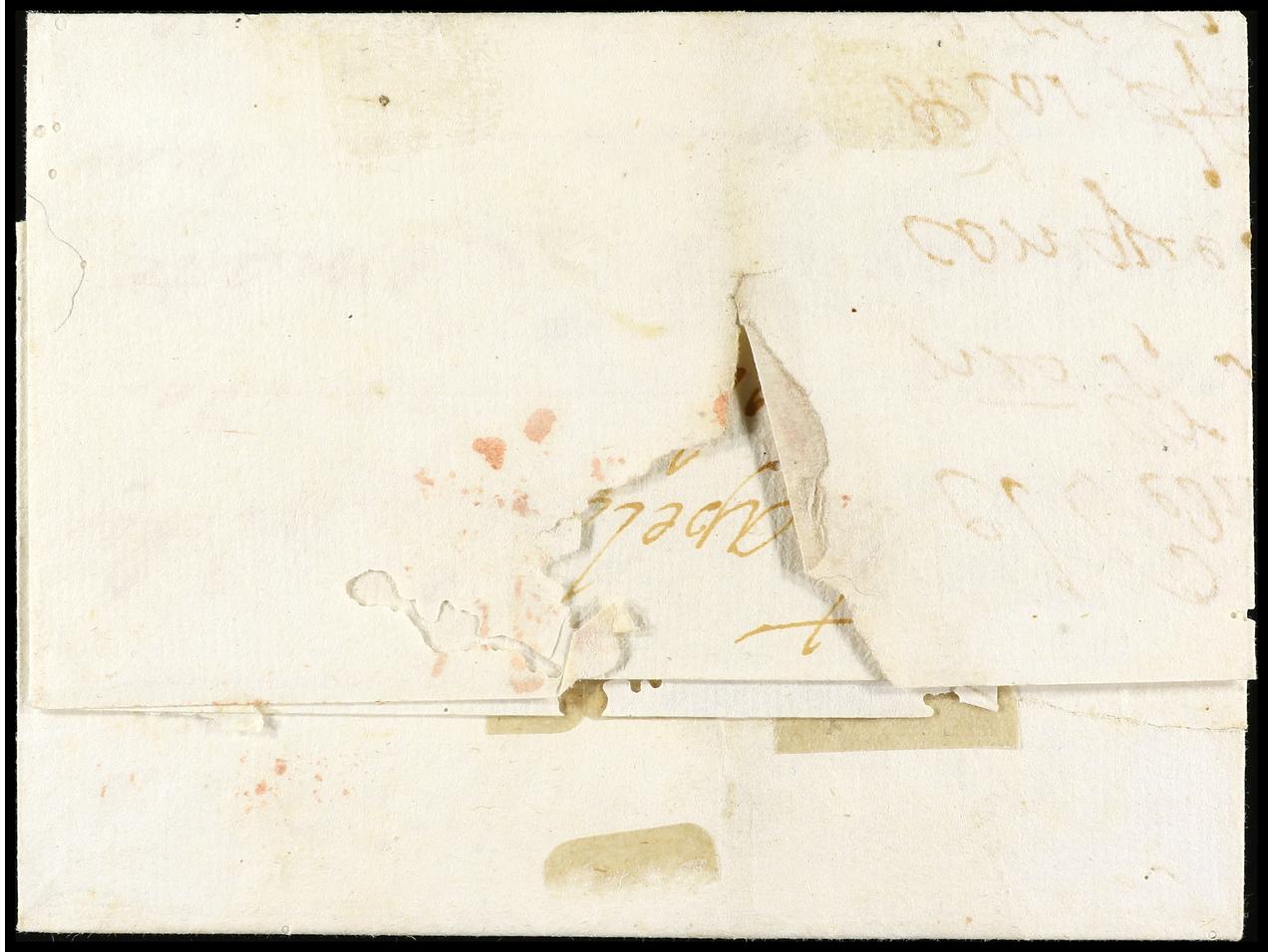 1168 c imageARGENTINA. (1809 ca.). SEVILLA a BUENOS AIRES. Envuelta sin texto circulada por vía fluvial hasta Cádiz. Marcas SEV/ANDALUCIA/BAXA, porte de 5 reales a la llegada, correspondiente a una carta doble. (Image1) (Image2)