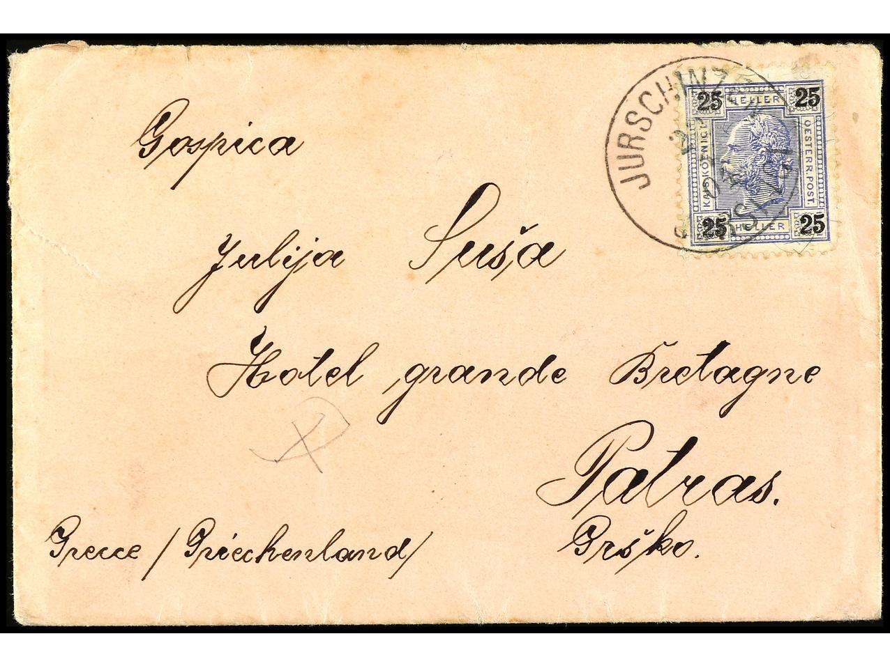1178 c imageAUSTRIA. 1901. JURSCHINZEN (Slovenia) a PATRIAS (Grecia). 25 h. mat. fechador. Yv.72. (Image1) (Image2)