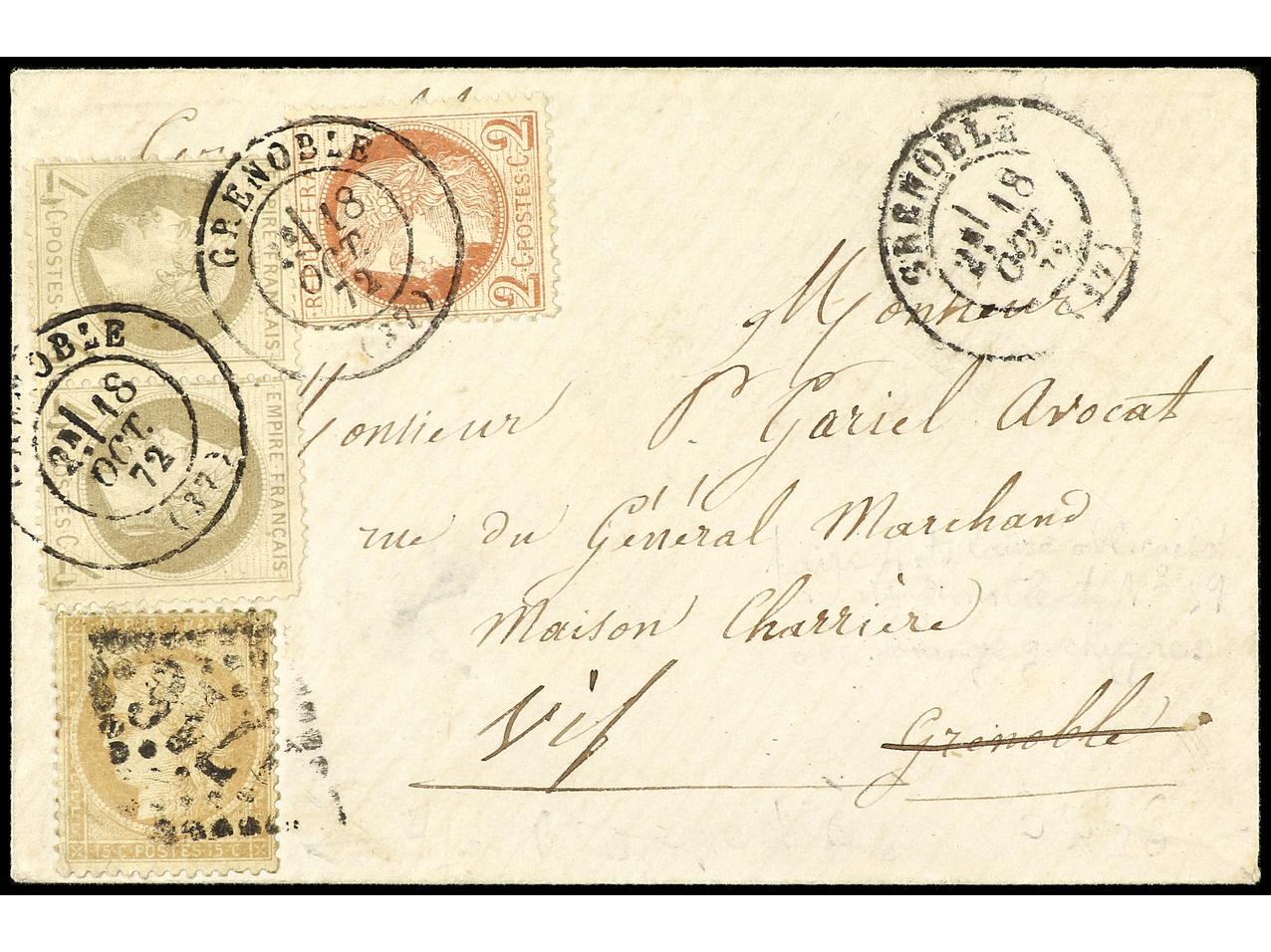 FRANCIA. 1872. GRENOBLE, correo interior 2 cts. castaño rojo, 4 cts. gris (2) (un sello leve defecto) reexpedida a VIF con sello de 15 cts. bistre. Rara combinación de franqueo. Yv.51, 52 (2), 55. (Image1) (Image2)