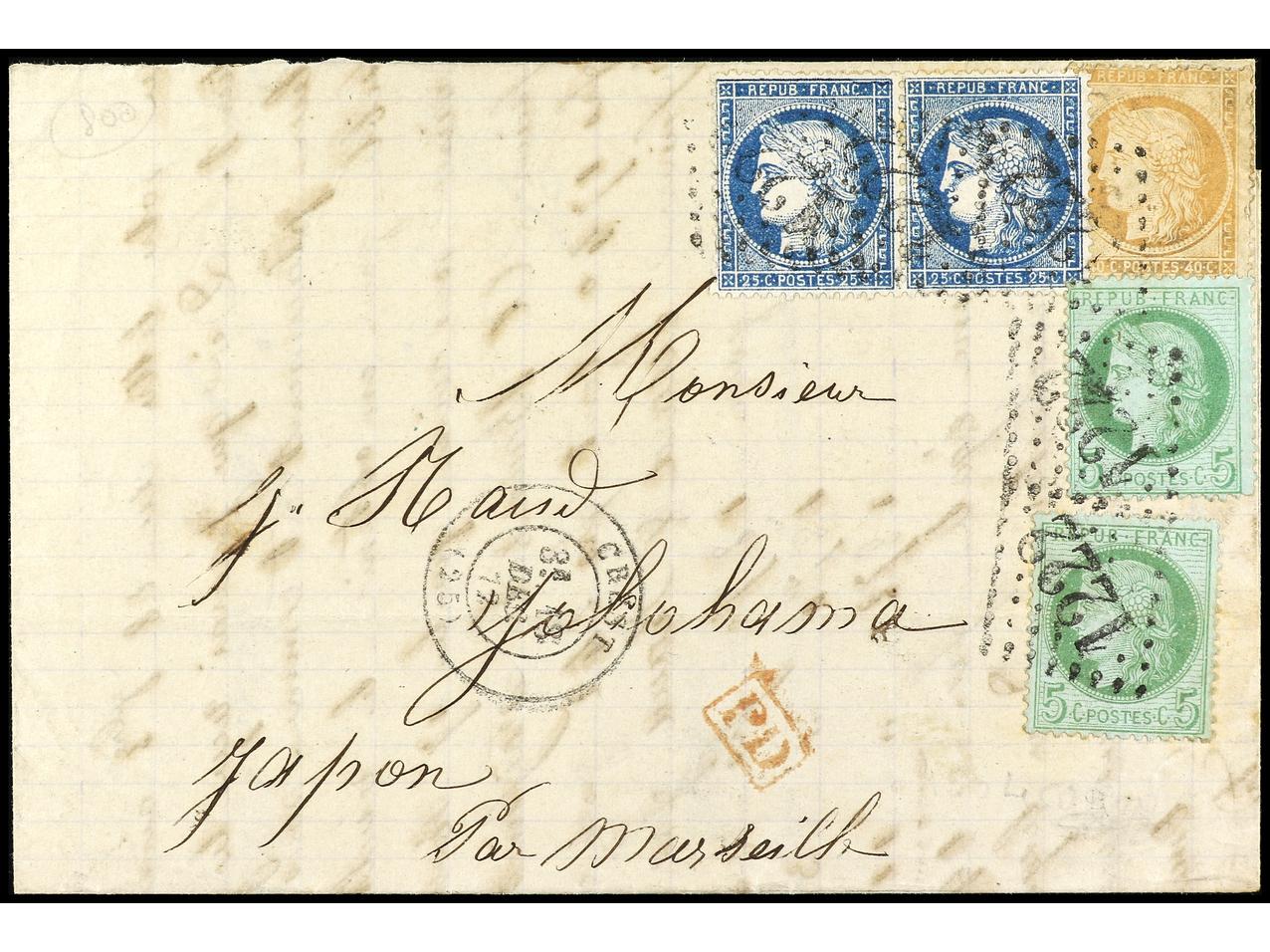 FRANCIA. 1872. CREST a YOKOHAMA (Japón). 5 cts. verde, 25 cts. azul (2) y 40 cts. naranja. Inusual destinación. Yv.53 (2), 60 (2), 38. (Image1) (Image2)