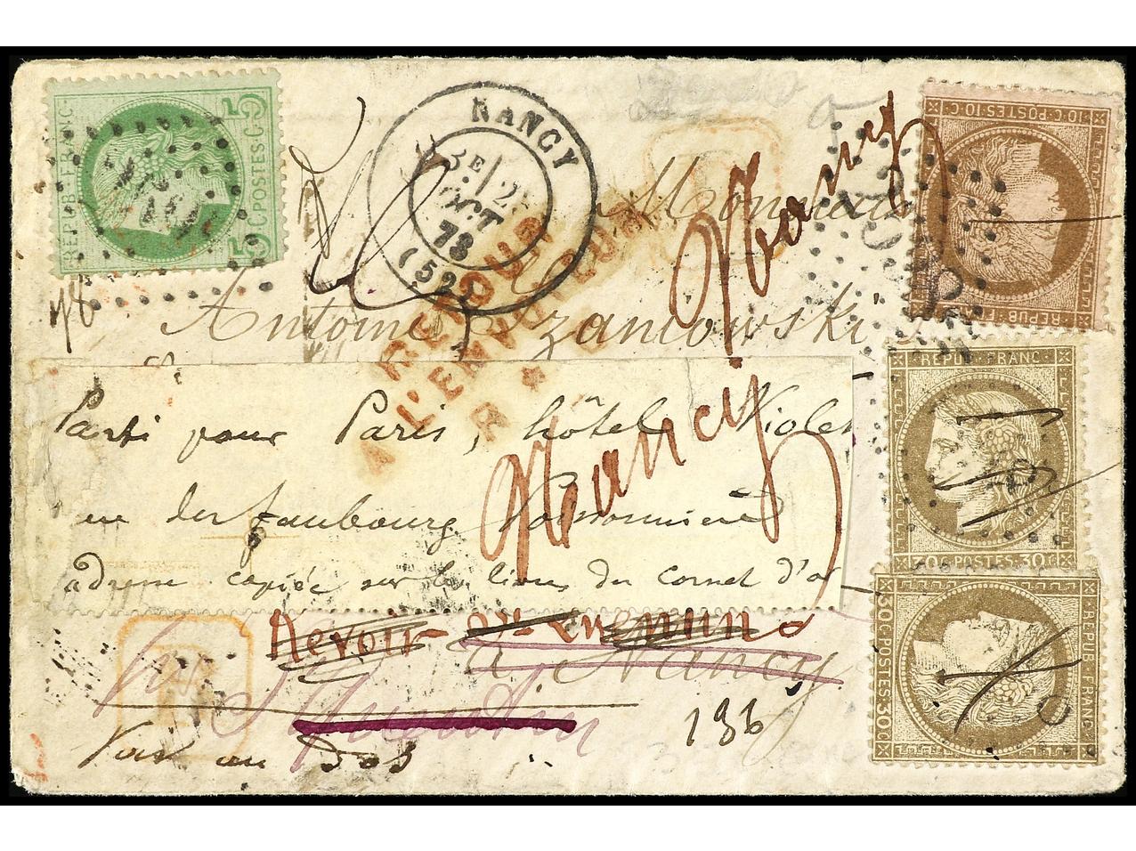 FRANCIA. 1873. NANCY. Carta certificada con sucesivas reexpediciones. Yv.53, 56 (2), 58. (Image1) (Image2)