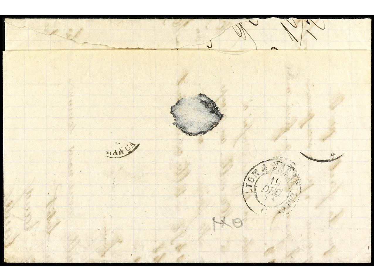 FRANCIA. 1873. PARÍS a VILLENEUVETTE. Circulada con sello de Colonias Generales (Yv. 13) con dentado particular para hacerlo pasar como un sello de Francia. Muy raro fraude al correo. Firmado CALVES y cert. BRUN. (Image1) (Image2)