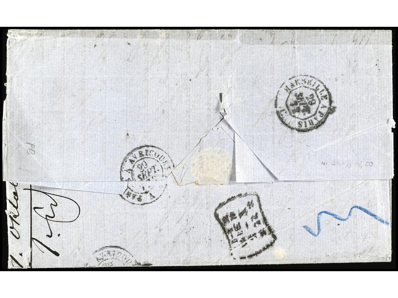 FRANCIA. 1874. PARÍS a ISMAILIA. 40 cts. naranja (2) y sello de Egipto de 1 pi. rojo. Precioso y MUY RARO franqueo mixto en el sentido Francia-Egipto.