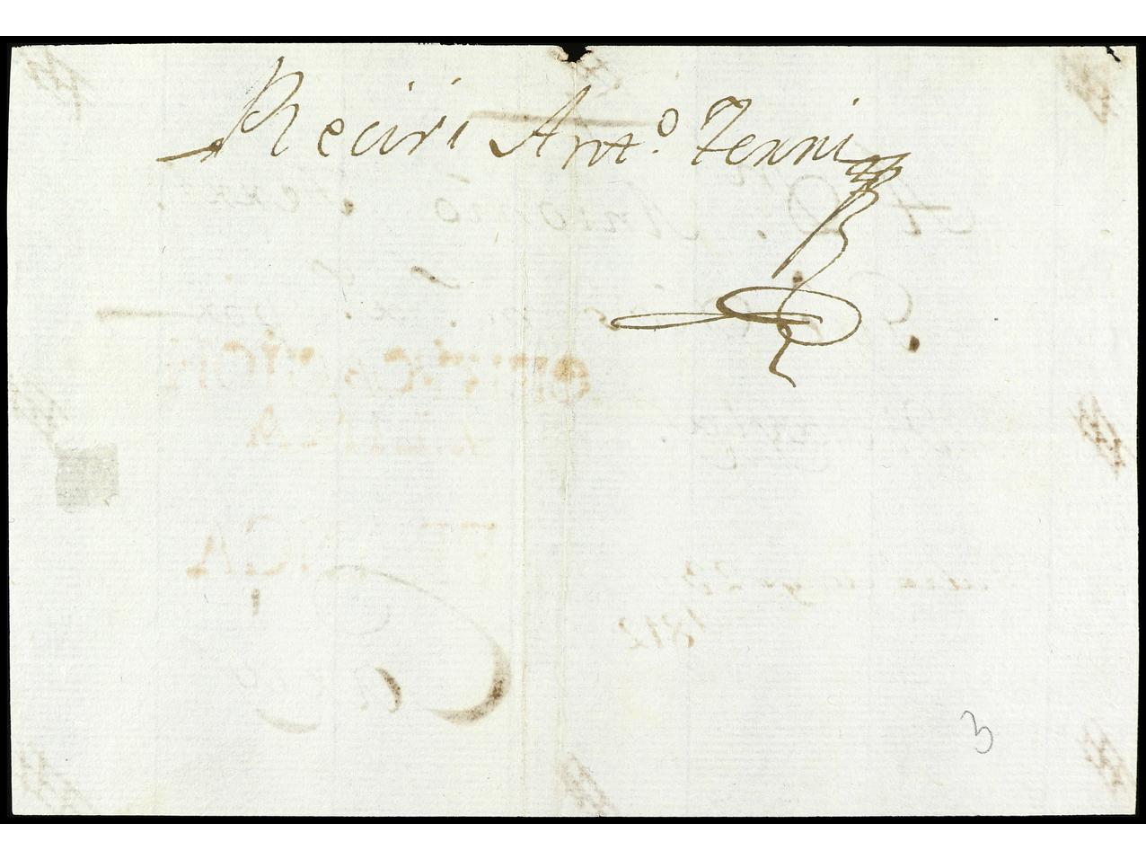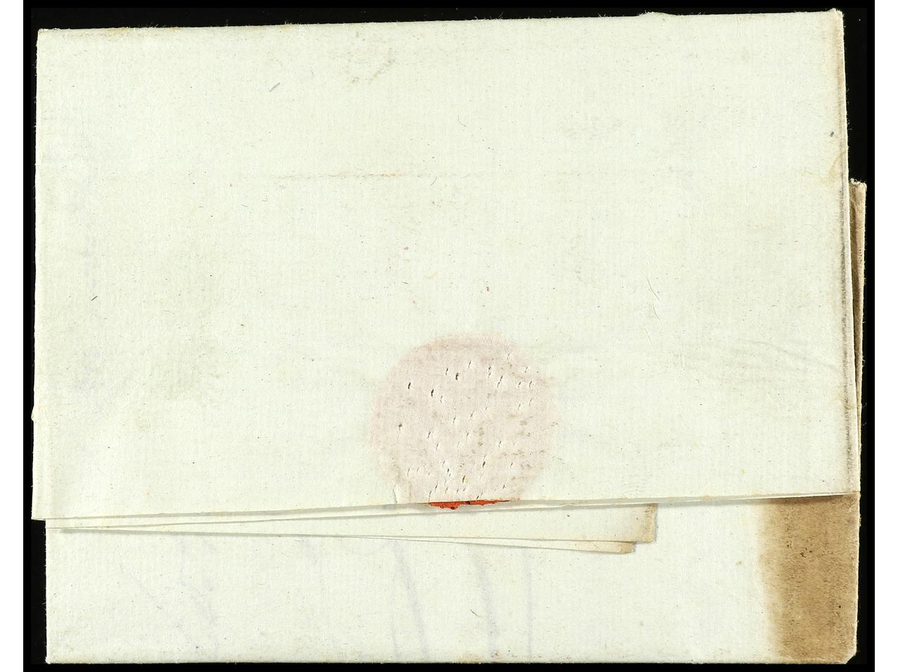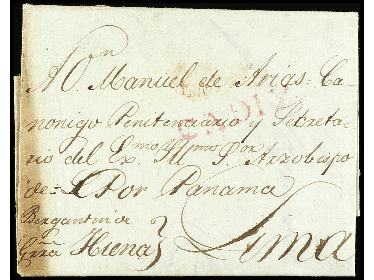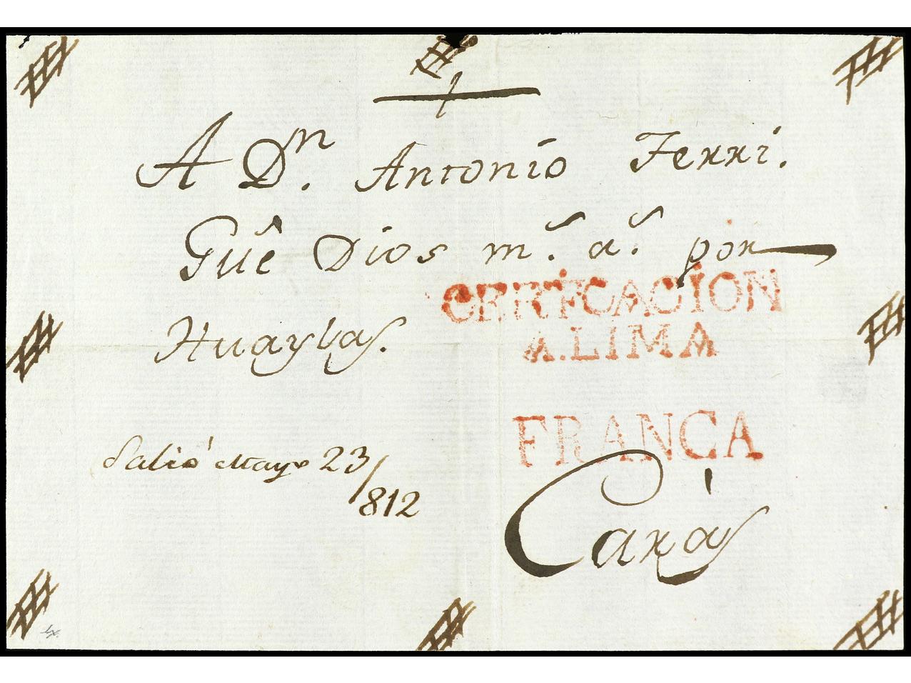 PERU. 1812 (23 mayo). Frente de carta certificada de LIMA a CARAZ. Marca CERTIFICACION/A LIMA y FRANCA ambas en rojo, al dorso ´recibí´ manuscrito de destinatario. (Image1) (Image2)