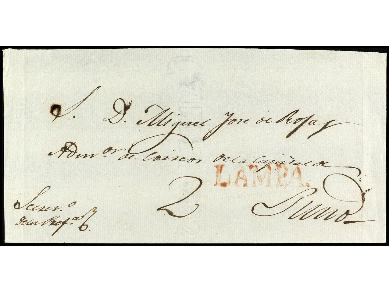 PERU. (1826 ca.). Frontal circulado a LIMA. Marca LAMPA en rojo. (Col. nº 1). (Image1)