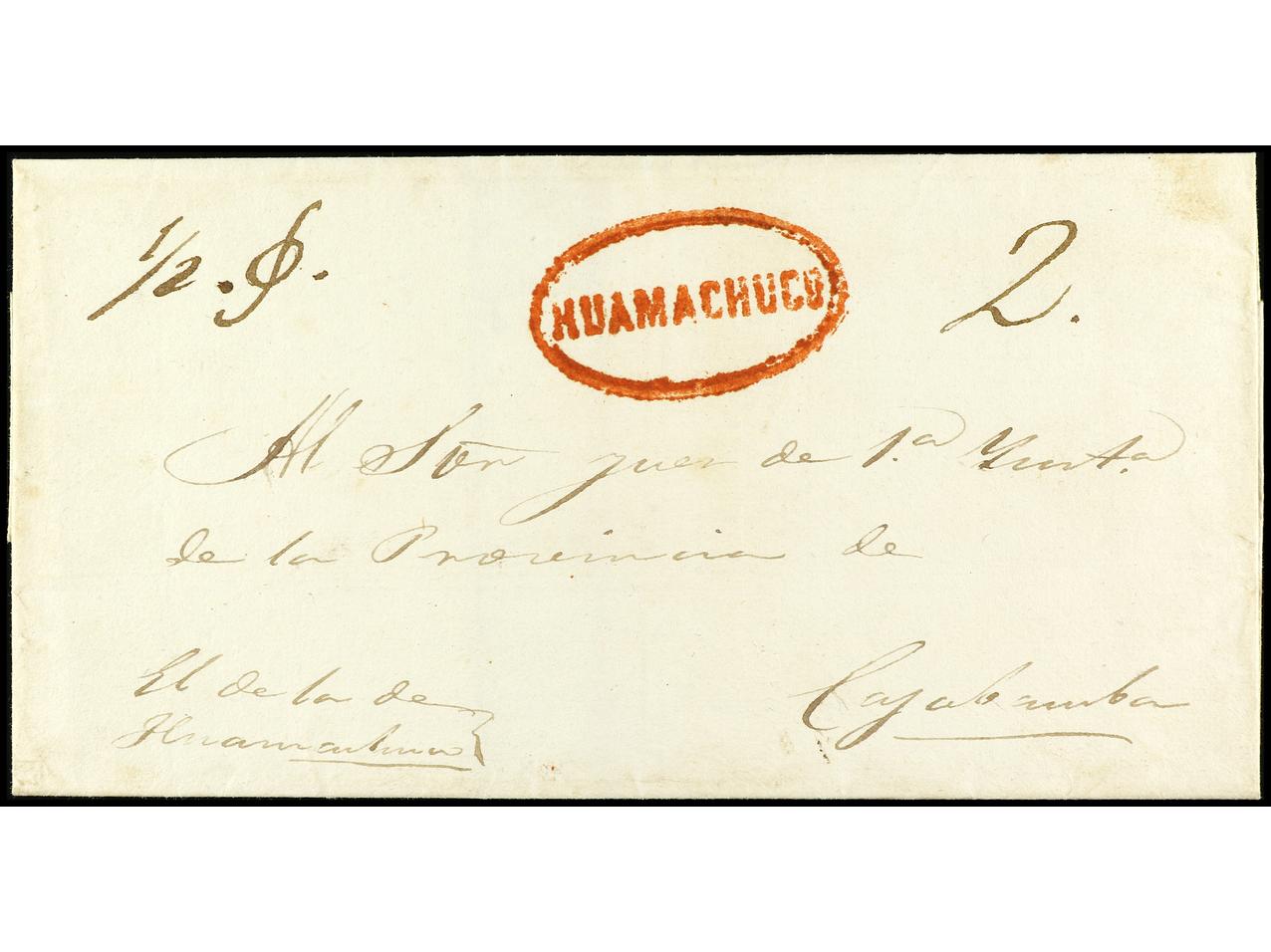 PERU. (1850 ca.). Envuelta circulada a CAJABAMBA. Marca HUAMACHUCO en rojo. PRECIOSA y MUY RARA. No reseñada en Colareta. (Image1) (Image2)