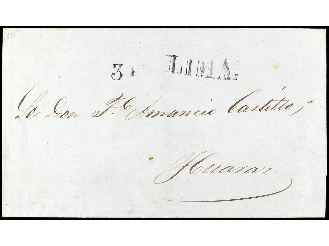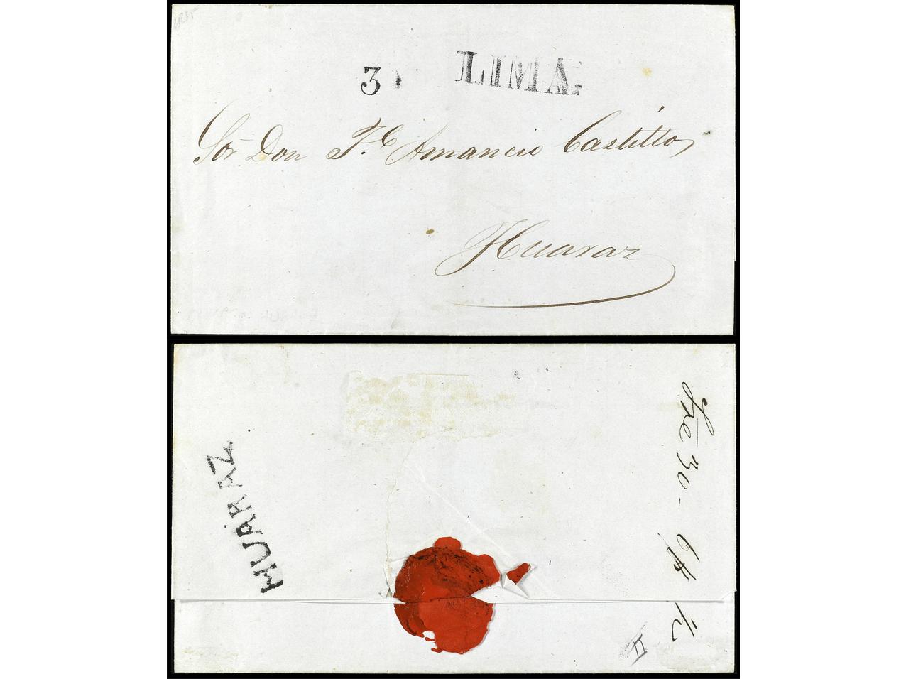 PERU. (1846 ca.). Envuelta circulada a HUARAZ. Marcas LIMA en negro (col. nº 19) y al dorso HUARAZ en negro. (Col. nº 4). (Image1) (Image2)