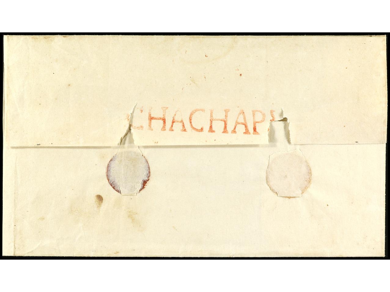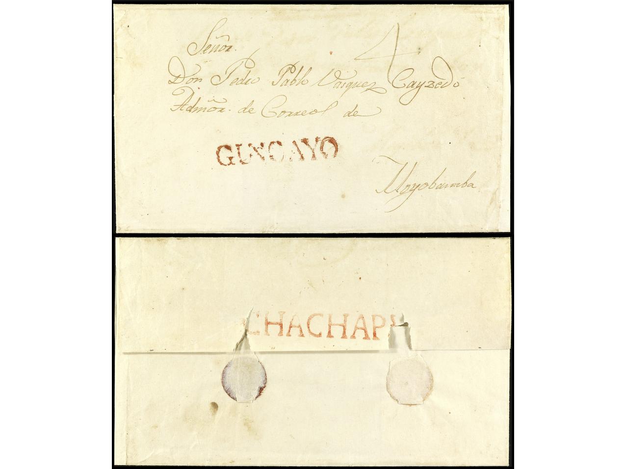 PERU. (1830 ca.). Envuelta circulada a MOYOBAMBA. Marcas GUANCAYO en rojo (col. nº 1) y CHACHAPOYAS en rojo (col. nº 1) en el reverso. (Image1) (Image2)