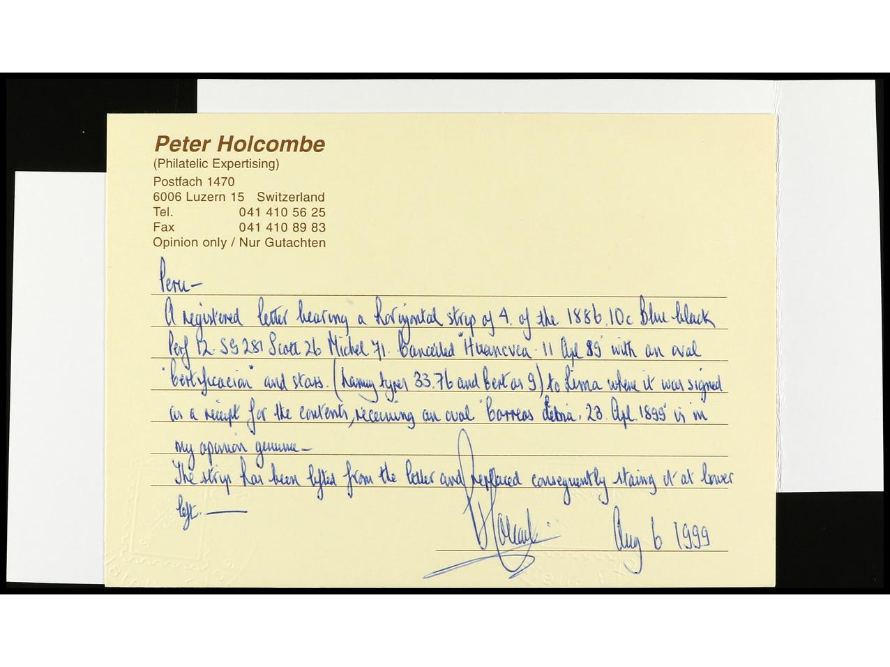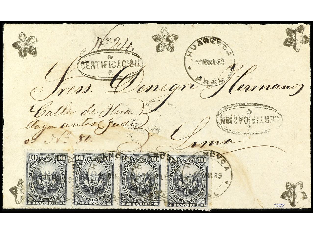PERU. 1889. HUANCAVELICA a LIMA. 10 cents. gris (4), marcas de certificación y al dorso ´recibí´ manuscrito del destinatario. Cert. HOLCOMBE. Ex. col. LAMY. Sc.110 (4). (Image1) (Image2)