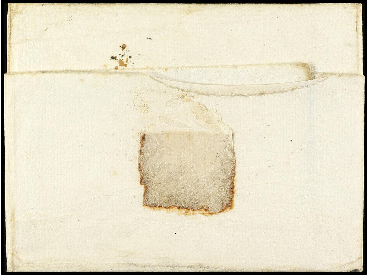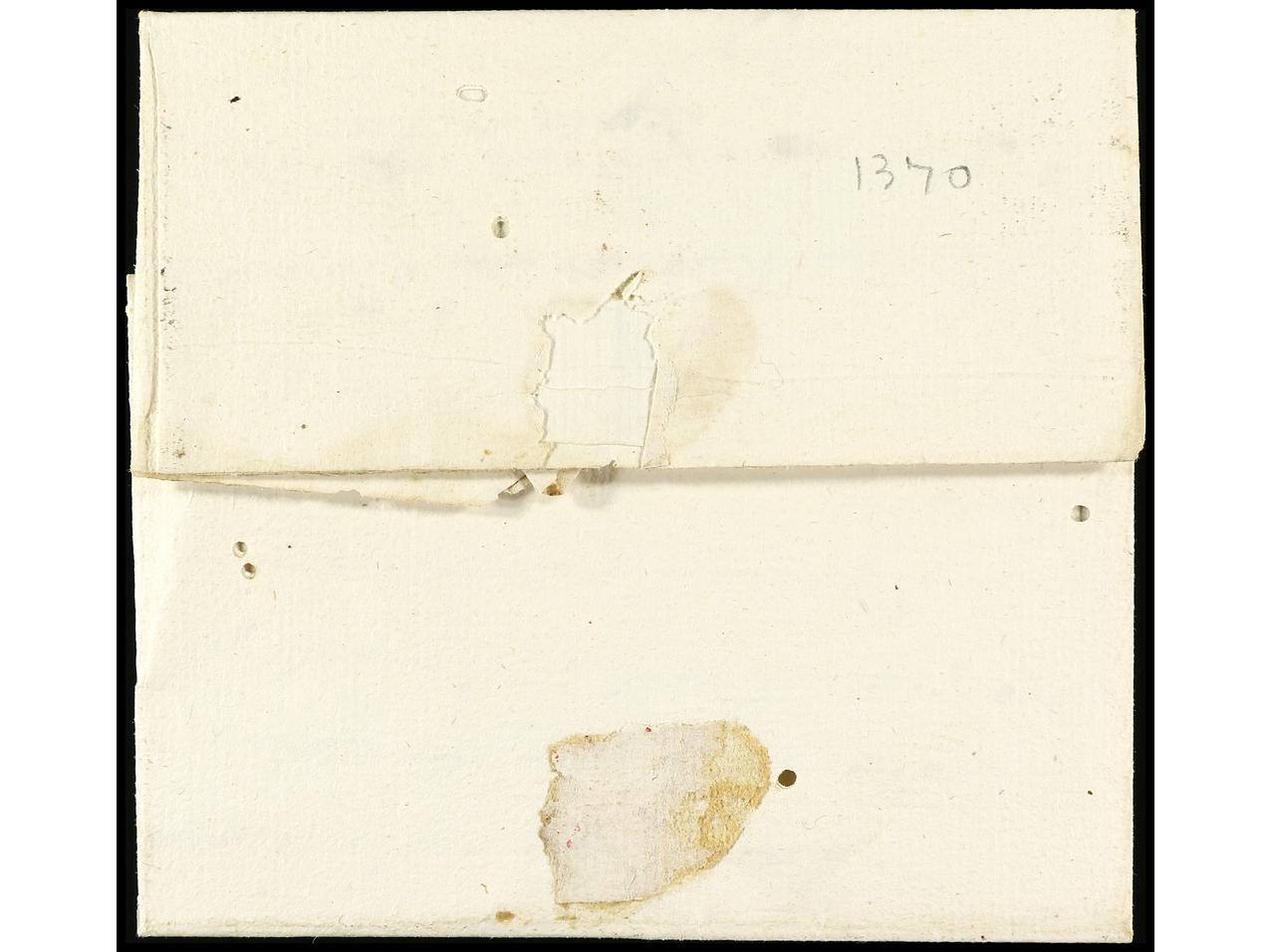 PERU. (1795 ca.). Envuelta circulada a YCA. Marca LAMBE (Lambayeque) en negro (col. nº 1). PRECIOSA y RARÍSIMA en época colonial. (Image1) (Image2)