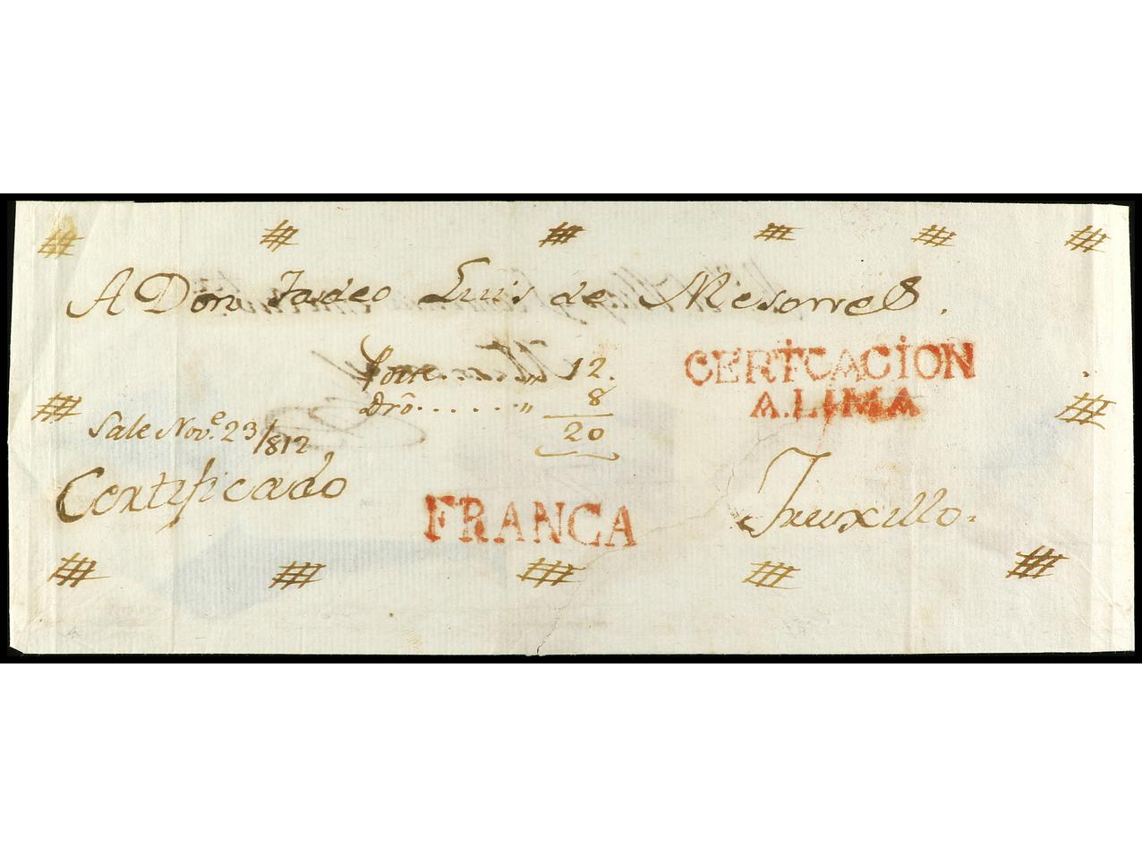 PERU. 1812 (23 noviembre). Envuelta de carta certificada de LIMA a TRUXILLO. Marcas CERTIFICACION/A LIMA y FRANCA, tarifa manuscrita en el frente Porte 12 reales y Derechos 8 reales en el interior ´recibí´ manuscrito del