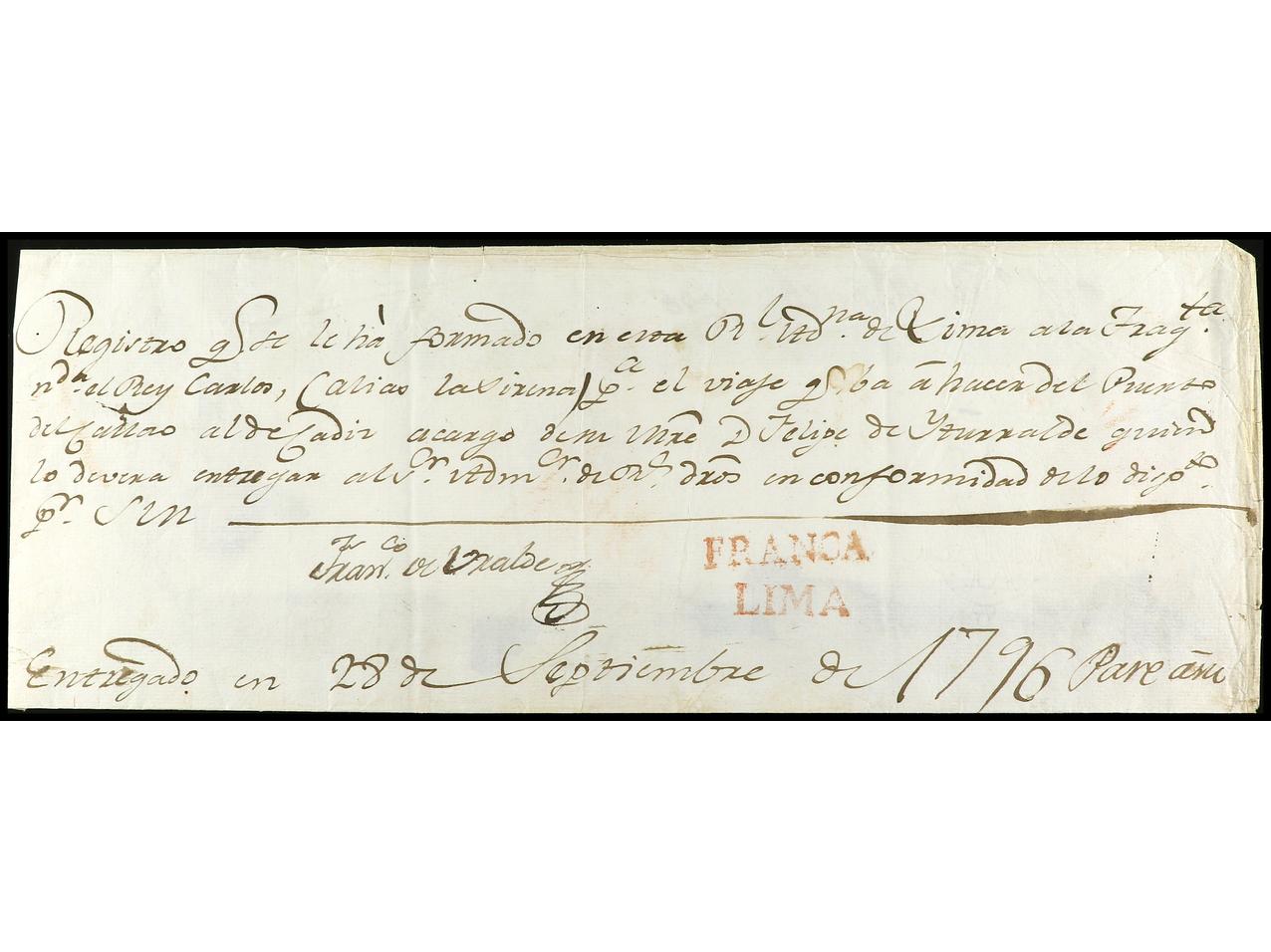 PERU. 1796 (28 septiembre). REGISTRO DE EMBARQUE de la Fragata ´El Rey Carlos´ circulado del CALLAO a CÁDIZ. Marcas LIMA y FRANCO en rojo. EXTRAORDINARIAMENTE RARO, único conocido en Perú durante el período colonial español. (Image1) (Image2)