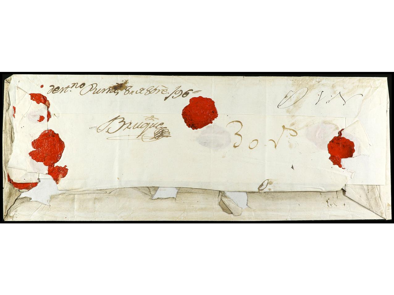 PERU. (1780 ca.). Frontal circulado a SANTIAGO. Marca LIMA en rojo, indicación manuscrita ´Por el Rey´ y anotación ´Virrey´ más porte de 49 reales de plata. (Image1)