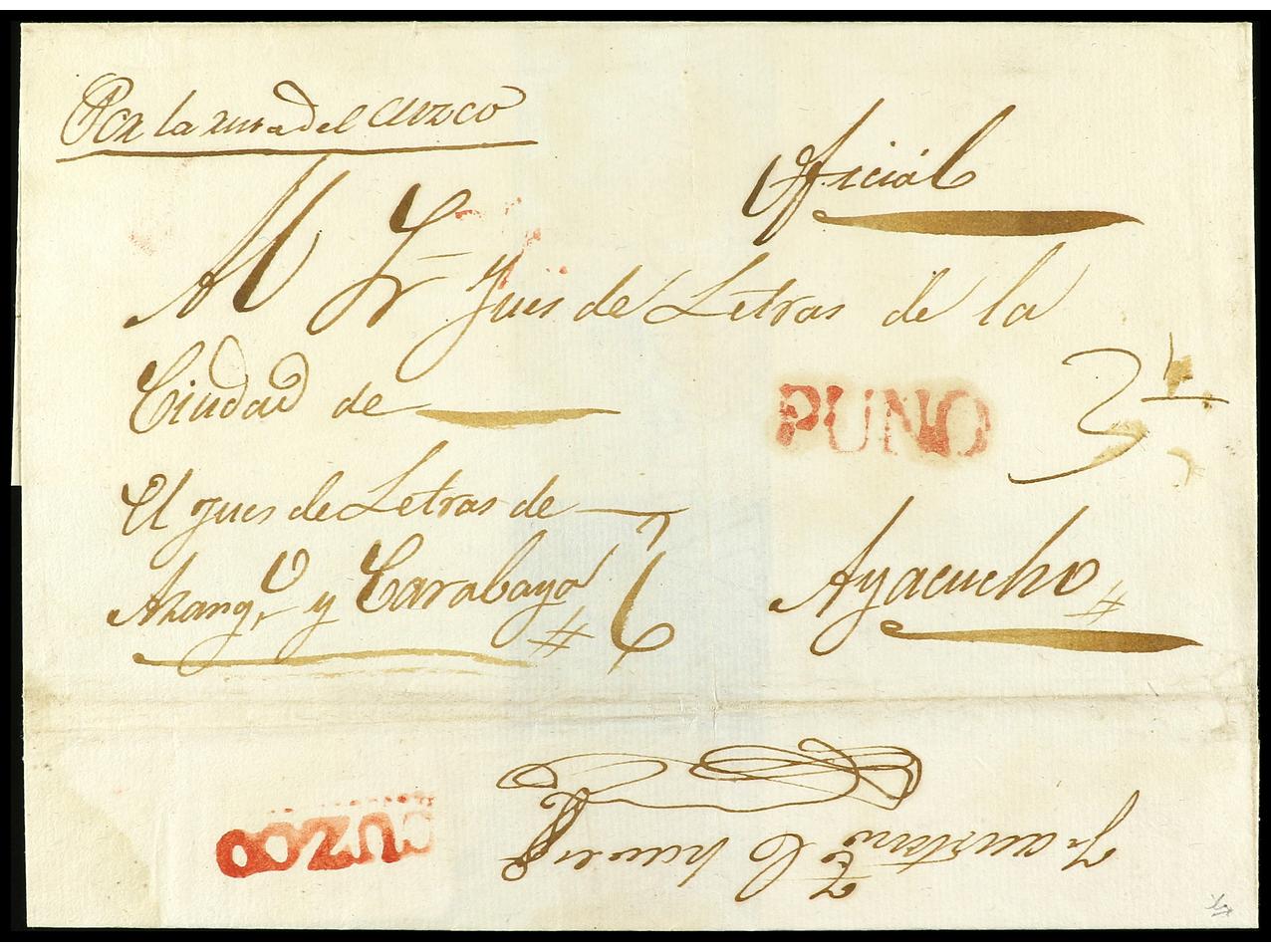 PERU. 1839 (12 enero). Envuelta del Servicio Oficial de PUNO a AYACUCHO. Marcas PUNO en negro y CUZCO en rojo estampada en tránsito. PRECIOSA.