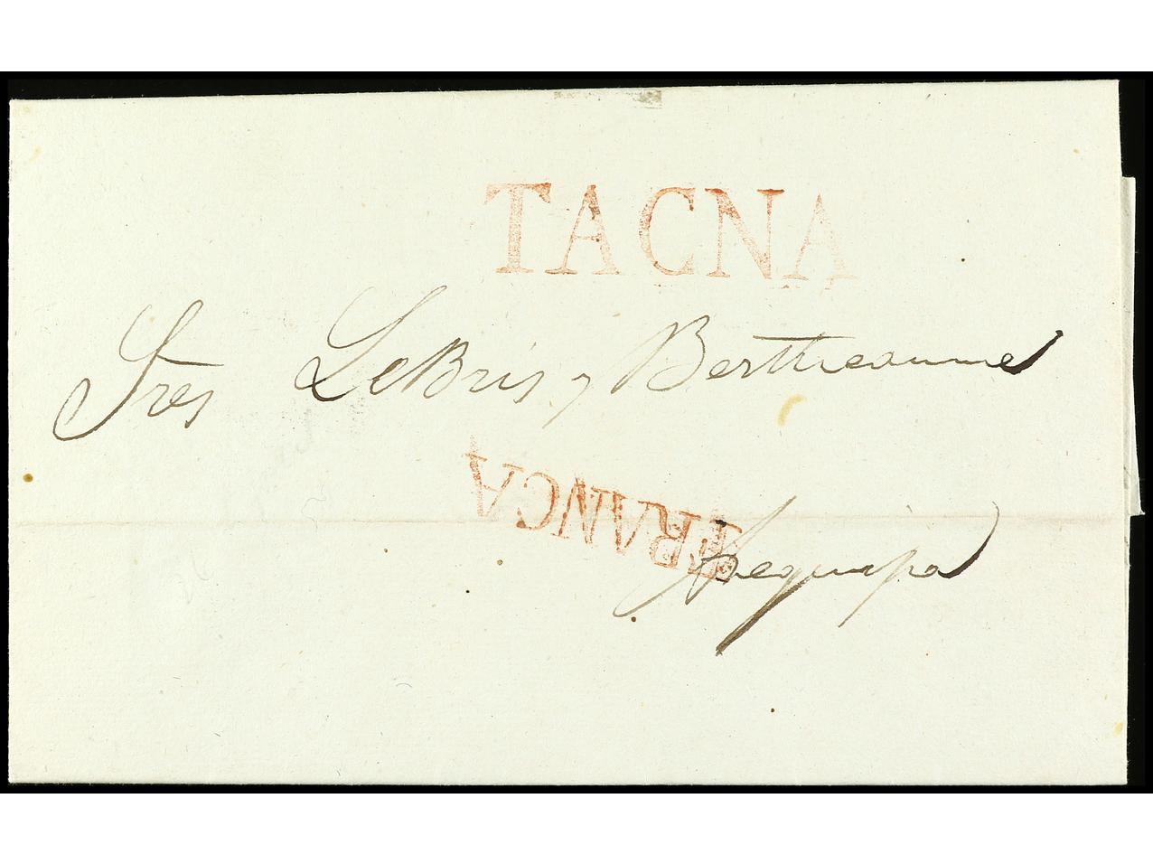PERU. 1831 (26 abril). TACNA a AREQUIPA. Carta completa con texto, marcas TACNA y FRANCA en rojo. (Col. nº 2 y 2f). (Image1) (Image2)