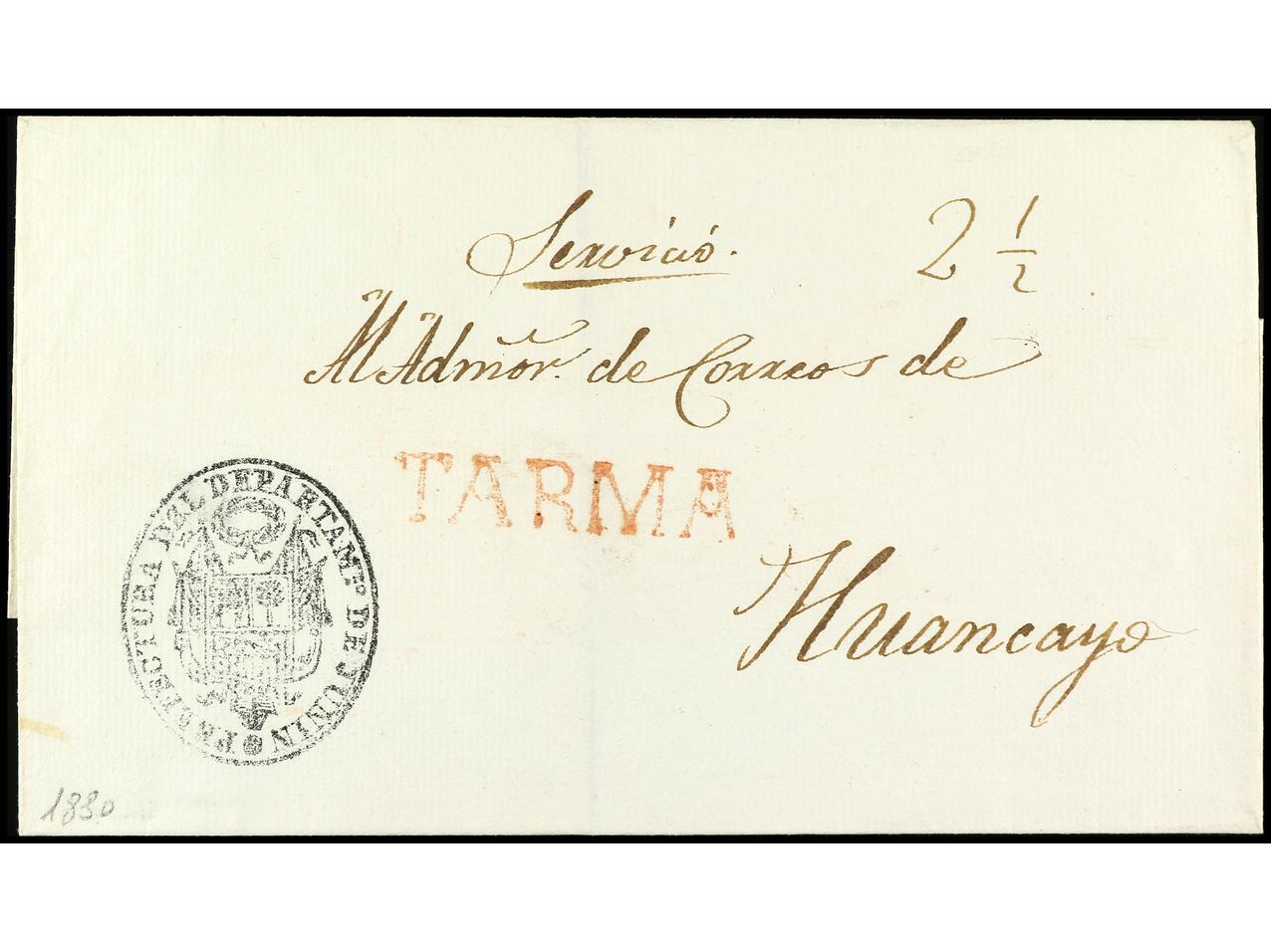 PERU. (1830 ca.). Envuelta circulada a HUANCAYO. Marca TARMA en rojo (col. nº 2) y marca de la Prefectura del Departamento de Junin. (Image1) (Image2)