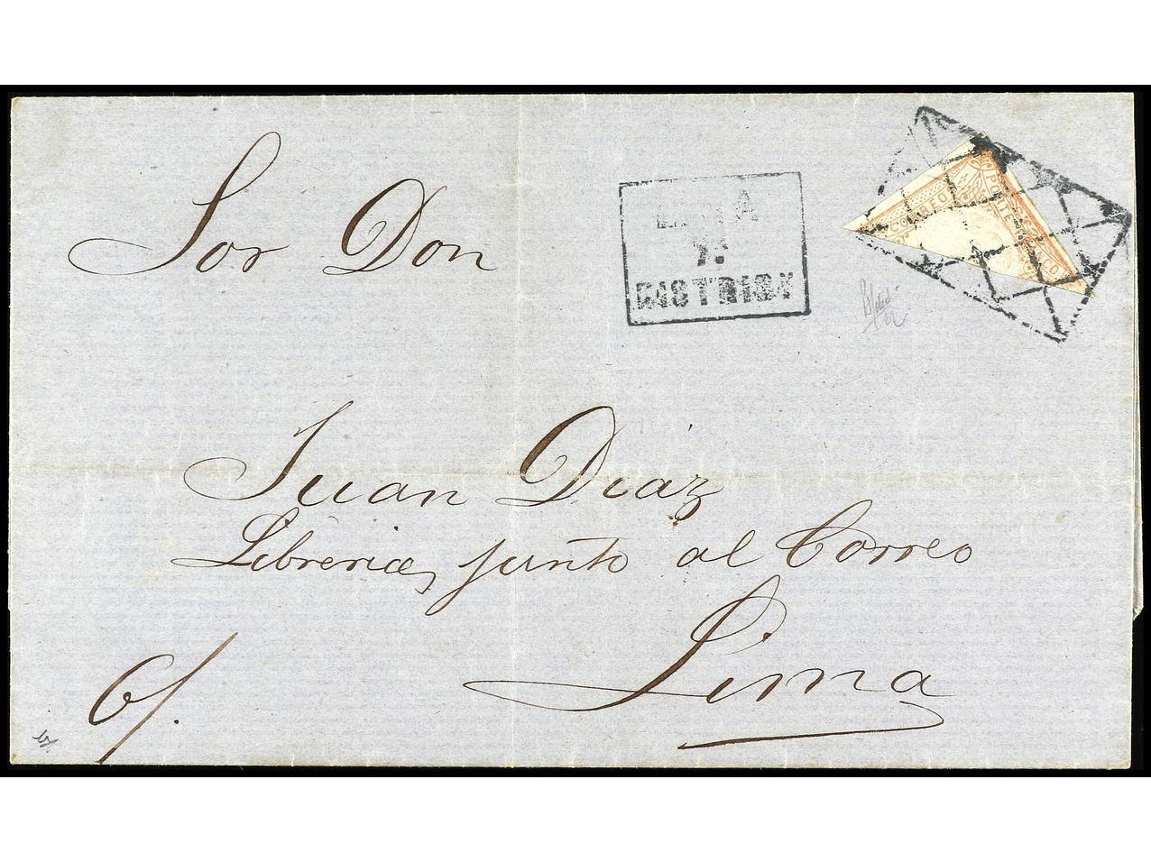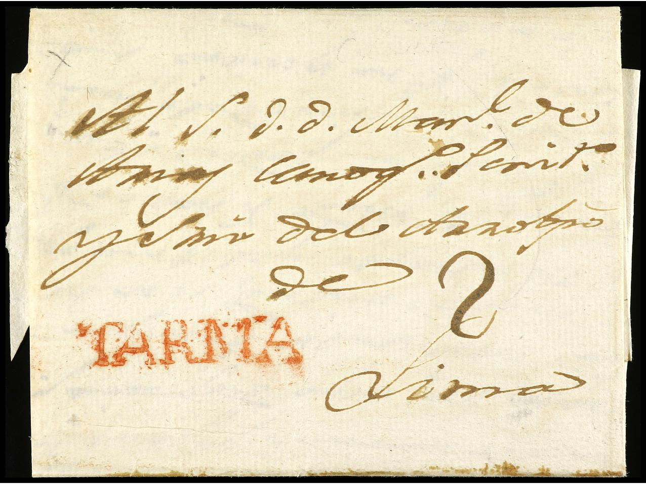 PERU. 1823 (octubre). TARMA a LIMA. Marca TARMA en rojo (col. nº 1). Carta dirigida a Manuel Arias que fue el Presidente del primer Congreso Constituyente del Perú. (Image1) (Image2)