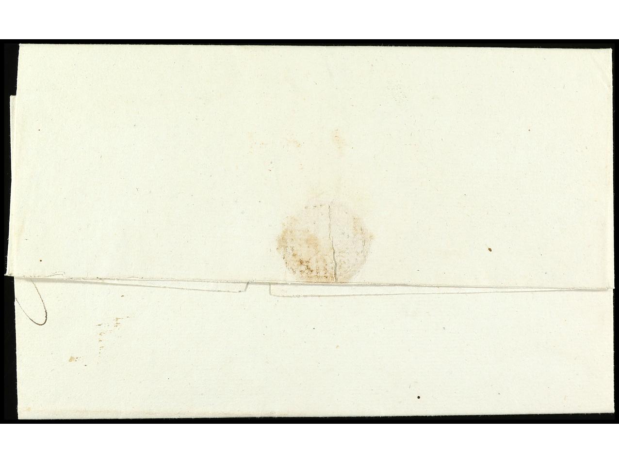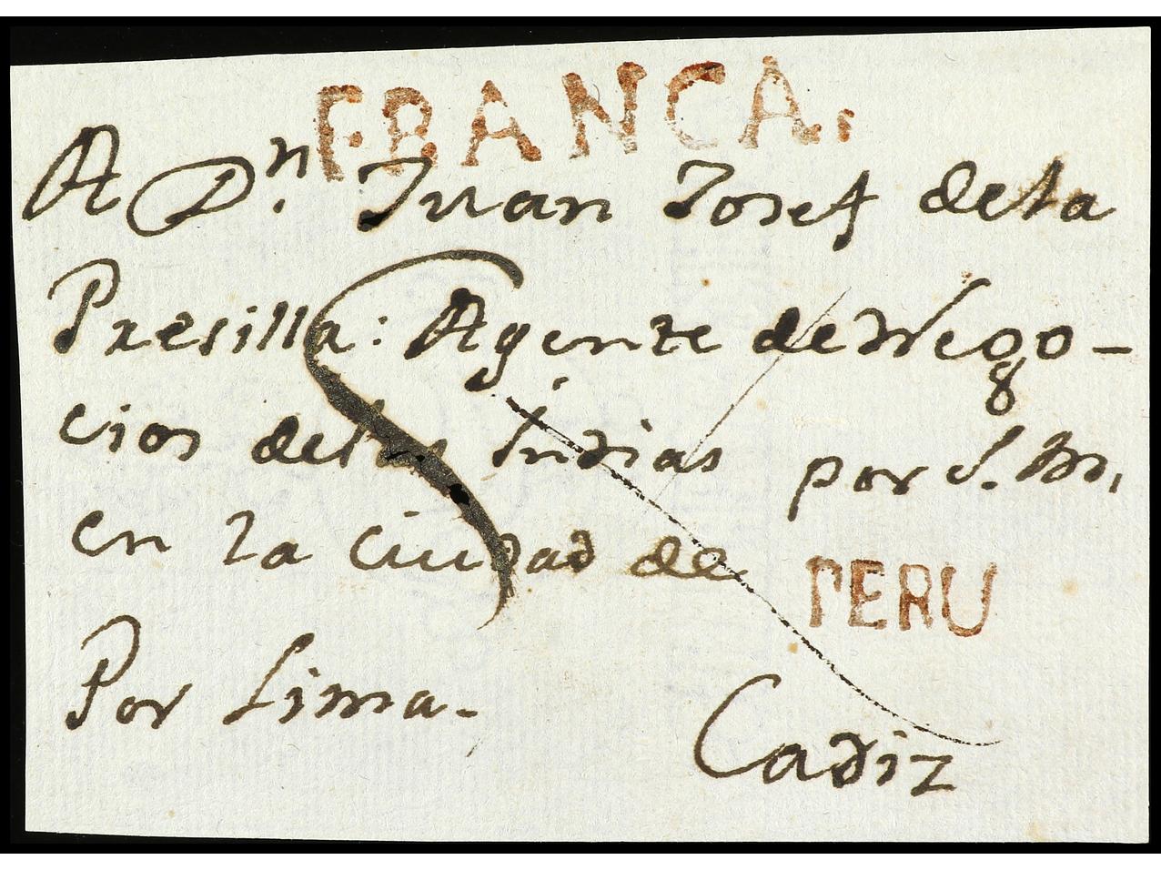 PERU. (1815 ca.). Frontal circulado a CÁDIZ. Marcas PERU y FRANCA en rojo de TRUXILLO. MUY RARAS. (Image1)