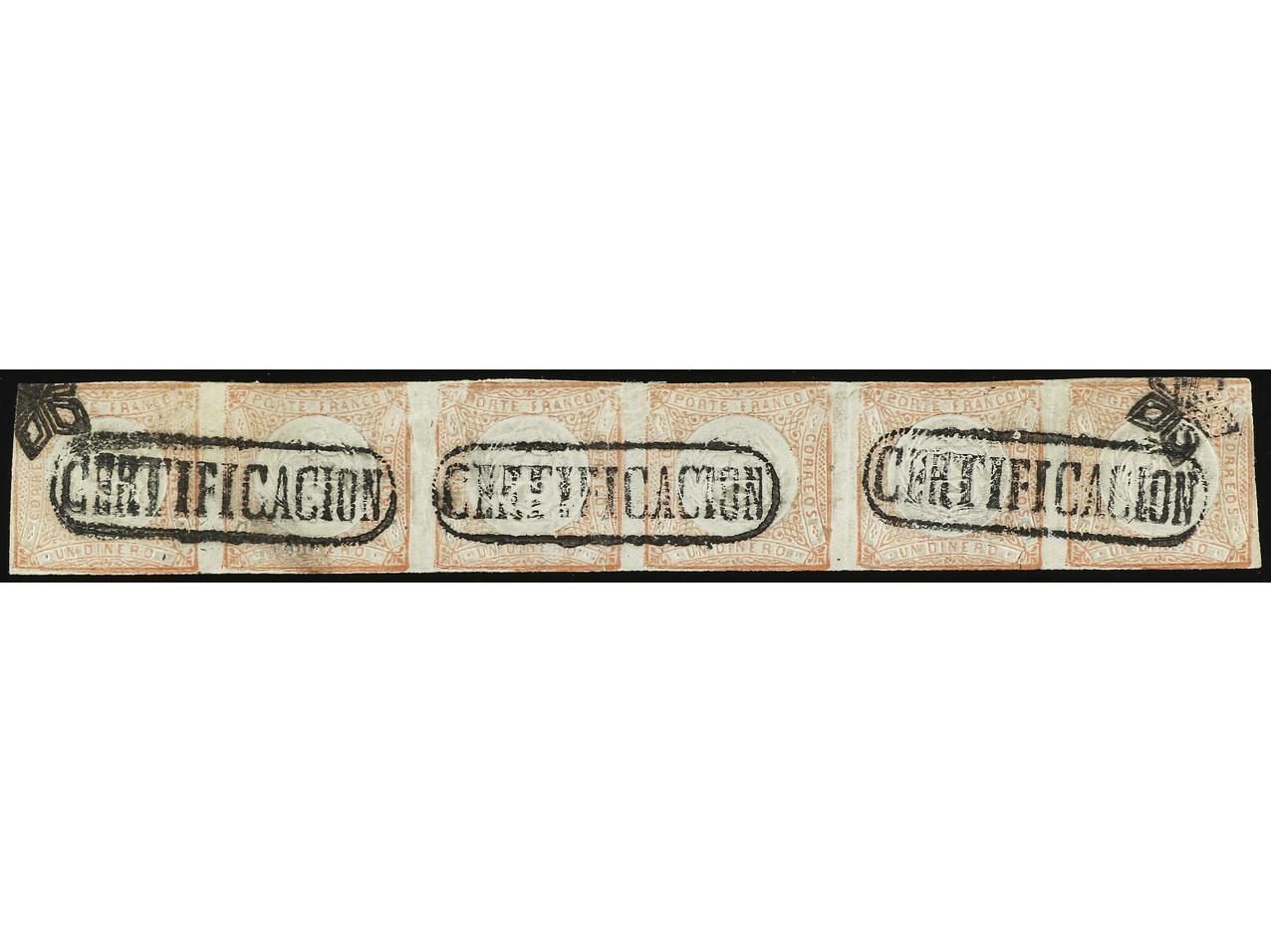 PERU. 1 dinero rojo. Tira de seis, mat. CERTIFICACION de Chachapoyas. Márgenes ajustados. RARA. Sc.12. (Image1)